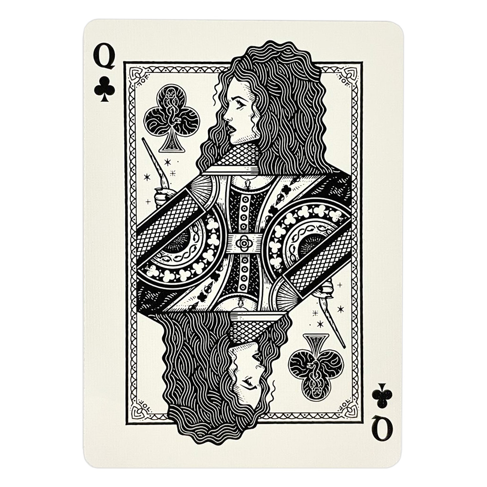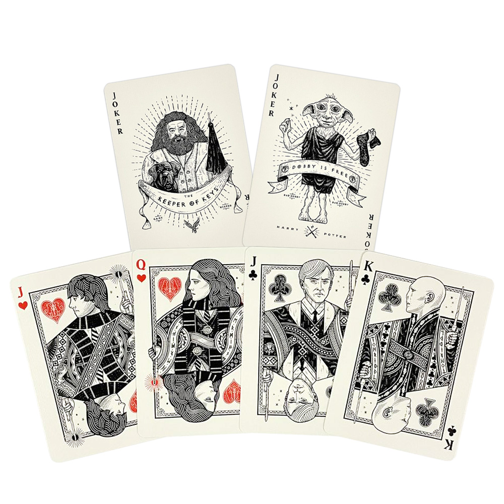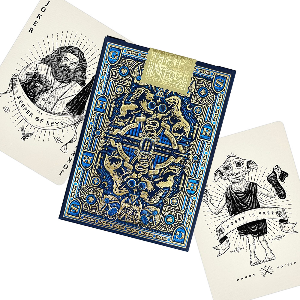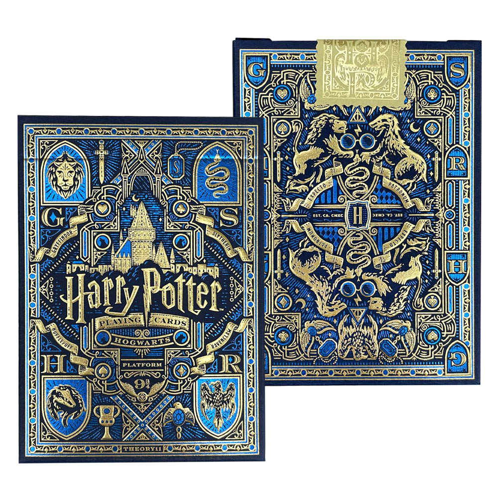 Коробка встречает изображением замка Хогвартс, платформы 9 и ¾, 4 гербами факультетов и другими мелкими элементами из рассказов. Theory11 применила метод теснения и золотую фольгу, чтобы всё это смотрелось идеально и натурально. Синяя колода олицетворяет дом Когтевран, но на изображениях можно встретить и других героев вселенной, вроде – Воландеморта в роли Короля.