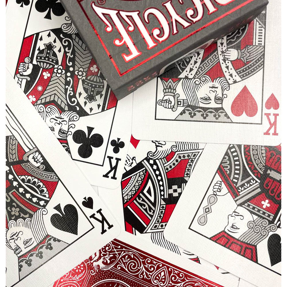 Качественная колода карт «Bicycle Metalluxe Red» от популярного производителя из США сочетает в себе хорошие материалы и достойный уровень изготовления. За долговечность отвечает пластиковая основа, а красоты добавляет металлизированный рисунок. За счёт этого достигается оптимальная цепкость, что позволяет применять их как для карточных игр, так и для показа фокусов, кардистри. Номиналы легко видимы, благодаря несколько укрупнённым индексам, а также классическому оформлению старших карт.
