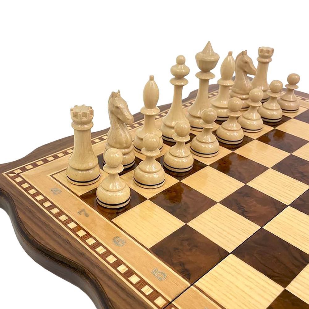 Шахматы Турнирные-3 - одна из самых изящных и изысканных моделей в нашем ассортименте. Изготовленная талантливым мастером из Армении, она является идеальным образцом изделий из дерева ручной работы. Массивная доска пленяет необычностью своих плавных форм. Она инкрустирована вставками драгоценных пород древесины и выполнена в технике маркетри. Утяжеленные фигуры выполнены в классическом для шахмат стиле. Каждая деталь изделия покрыта защитным лаком, предотвращающим появление царапин и других следов механических повреждений.