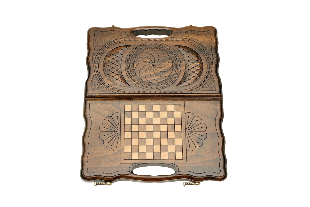 Резные нарды «Бесконечность» - эксклюзивный подарочный набор, который гарантировано понравится любому поклоннику традиционных настольных игр. Сделанная из натуральной буковой древесины доска, украшена оригинальным резным узором, символизирующим водоворот, бесконечность. На обратной лицевой стороне доски есть поле для игры в шашки. Скрепляются части доски бронзовыми петлями, поэтому о ее износостойкости и долговечности переживать не стоит.