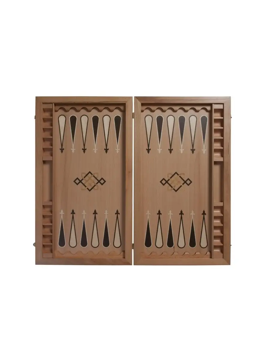 Игральное поле имеет лаконичный геометрический узор, подчёркивающий лузы по периметру. По краям поля расположены специальные карманы с ячейками для хранения фигур. В комплект входят два вида фишек из дерева тёмного и светлого оттенка и две игральные кости.