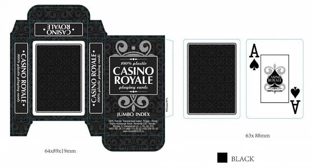 Вы знаток или просто любитель одной из самых азартных игр? Тогда игральные карты известной серии Casino Royale - это то, что Вам нужно! Сделаны карты из 100% пластика и покерного размера, что придаёт им особое удобство. Во время игры такие карты будет приятно держать в руках.