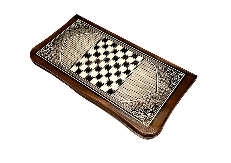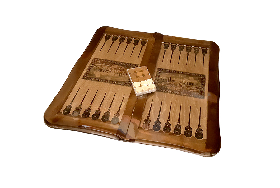 Центральным украшением служит изображение старинной достопримечательности, выполненной в чёрно-белом варианте. Задняя поверхность украшена мелким узором, который окружает поле для игры в шашки. Внутри в центре находятся ещё фотографии с видами города, а каждый слот для фишек дополнительно украшен орнаментом. Такой внешний вид сразу привлекает внимание, ведь в его исполнении видна рука опытного мастера.