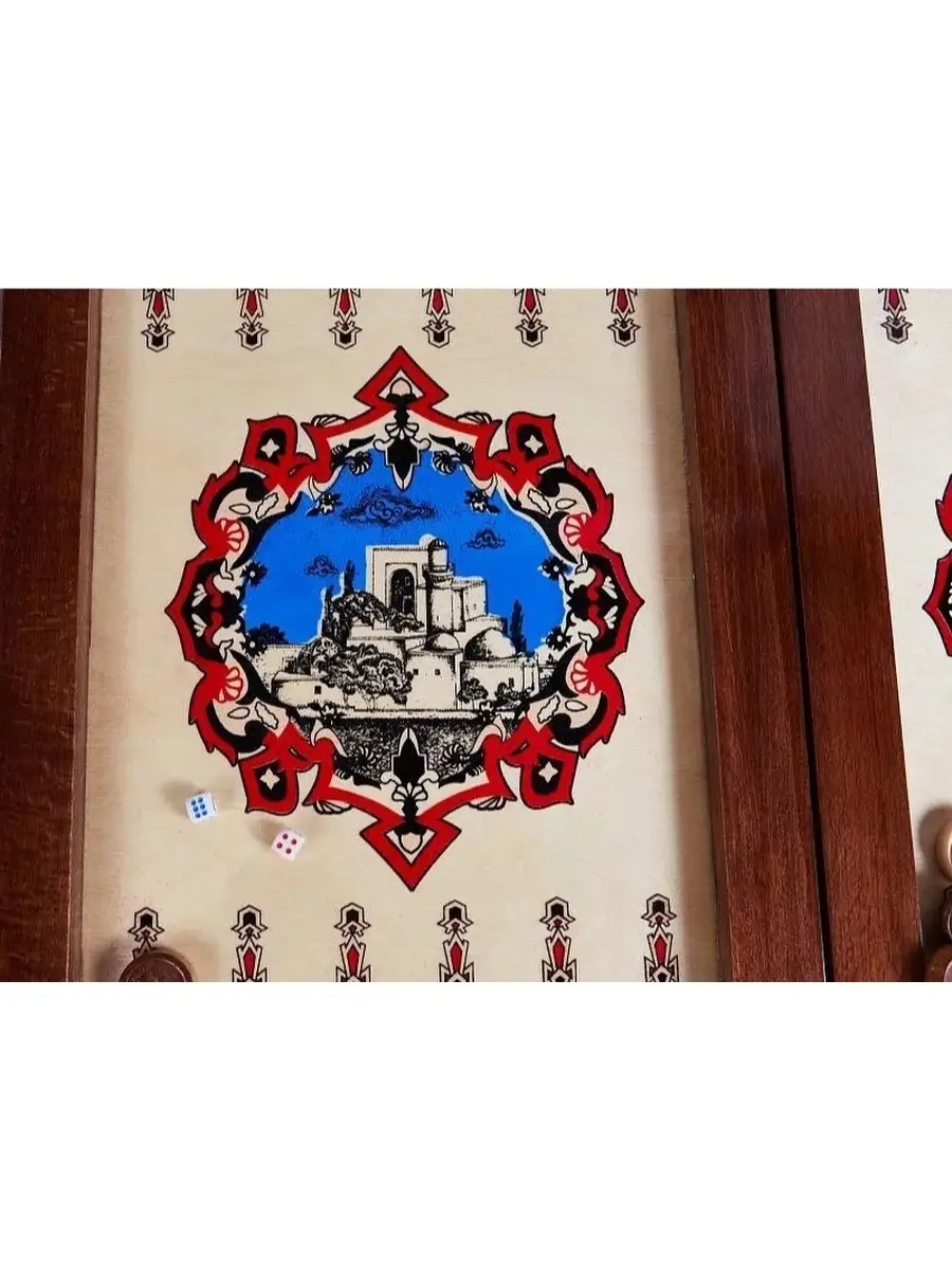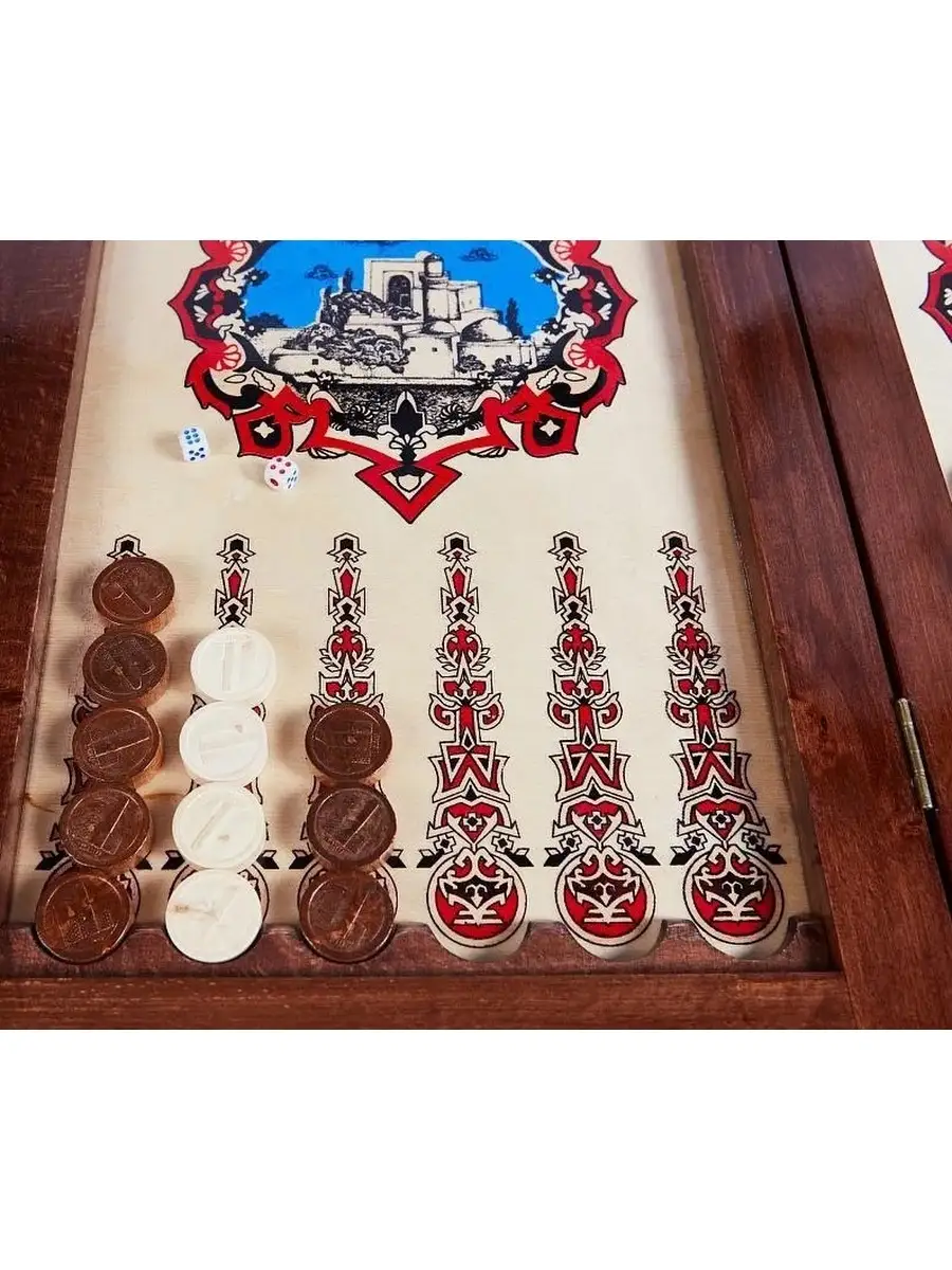 Нарды Бакинские «Девичья башня» в дипломате украшены со всех сторон. Лицевая поверхность полностью замощена интересным узором, который окаймляет красивое центральное изображение. С обратной стороны картина похожа, но вместо изображения предусмотрено поле для игры в шашки. Такой подход позволяет без проблем хранить закрытую доску на открытом пространстве, так как она не только не испортит вид, но и дополнит его некой изюминкой.