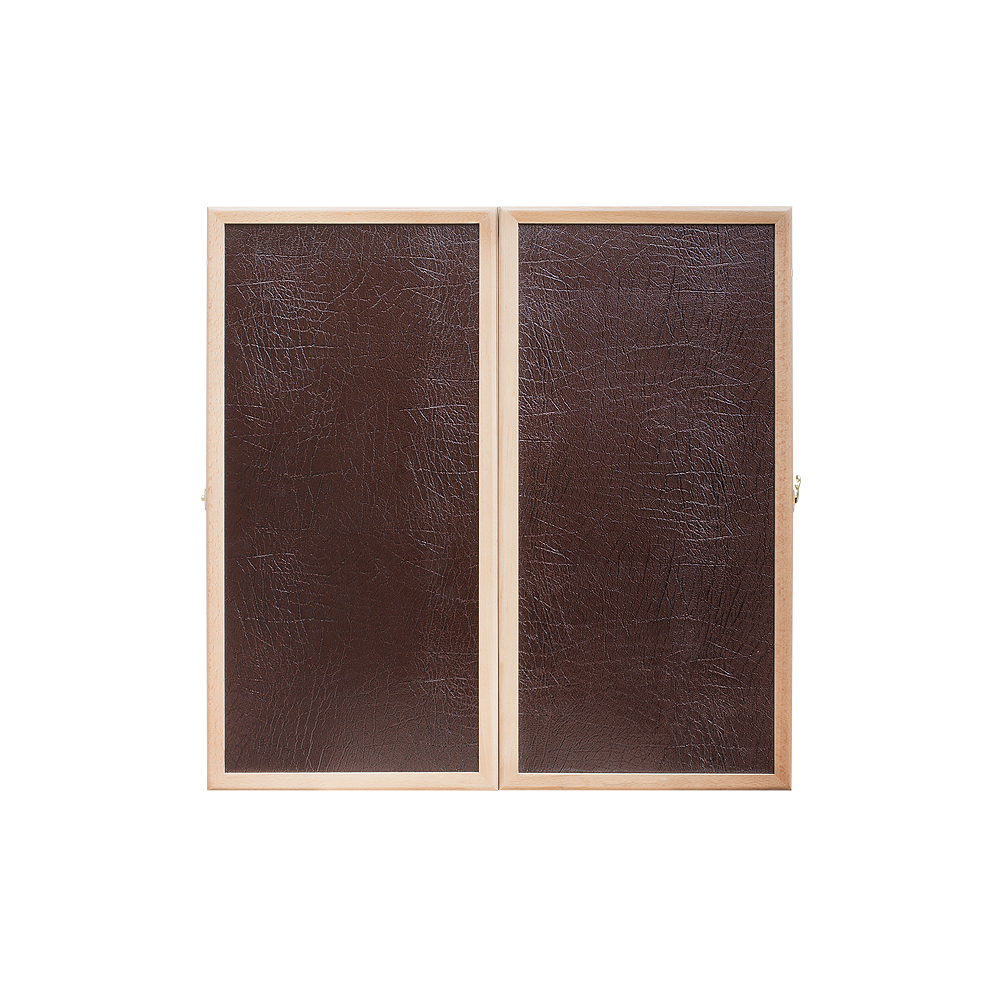 Вставки из кожи ярко выделяют игровую доску среди других экземпляров. Им оформлены обе лицевые стороны Нарды кожаные Шарм «Кайман» соответствующей тёмной расцветки. Внутри украшением выступают центральные узоры и каплевидные рисунки у каждого слота для фишек. Металлические петли не только сдерживают створки между собой, но и аккуратно вписываются в общий антураж, дополняя картинку.