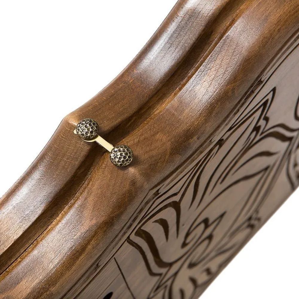 Сама древесина бука обладает очень интересной текстурой, которая тут специально подчеркивается лакированным покрытием. С внешней стороны вырезано вручную изображение гор Армении. Мастер выполнил резьбу очень качественно и в своей, уникальной манере. Резьба специально сделана в выпуклом виде, что придает им некоторую уникальность. На другой створке вырезано поле для игры в шашки, для чего можно будет использовать фишки из комплекта поставки. Внутренние поверхности украшены мелким рифлением на каждой отдельной ячейке.