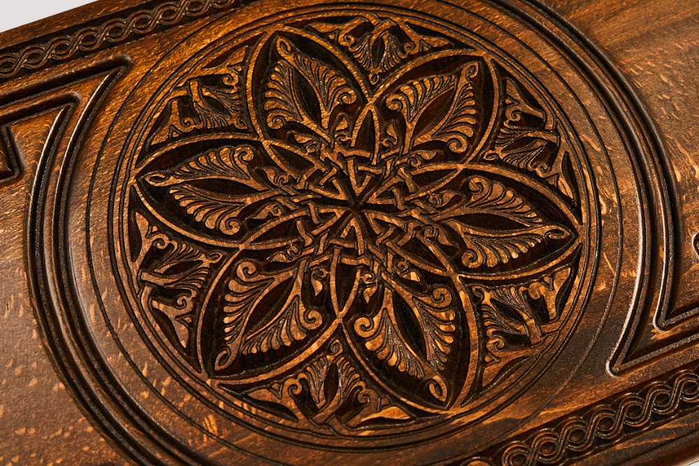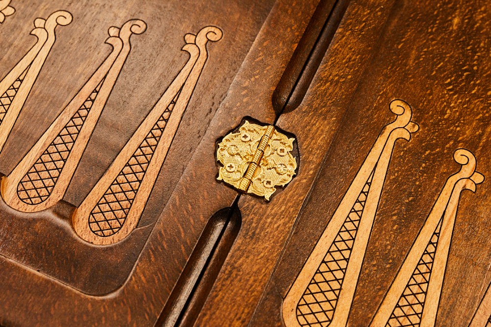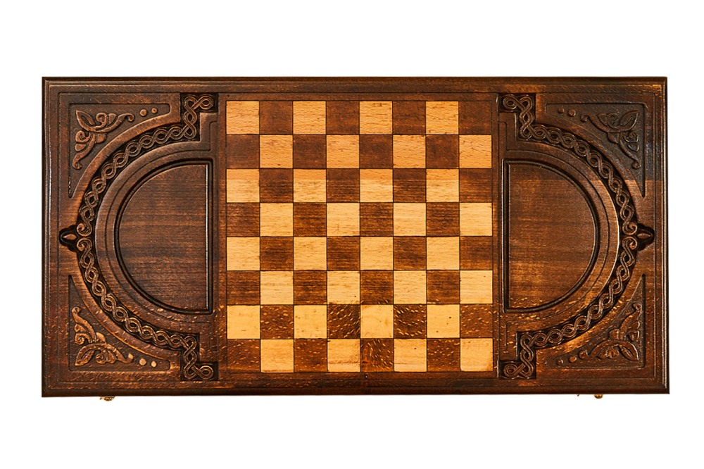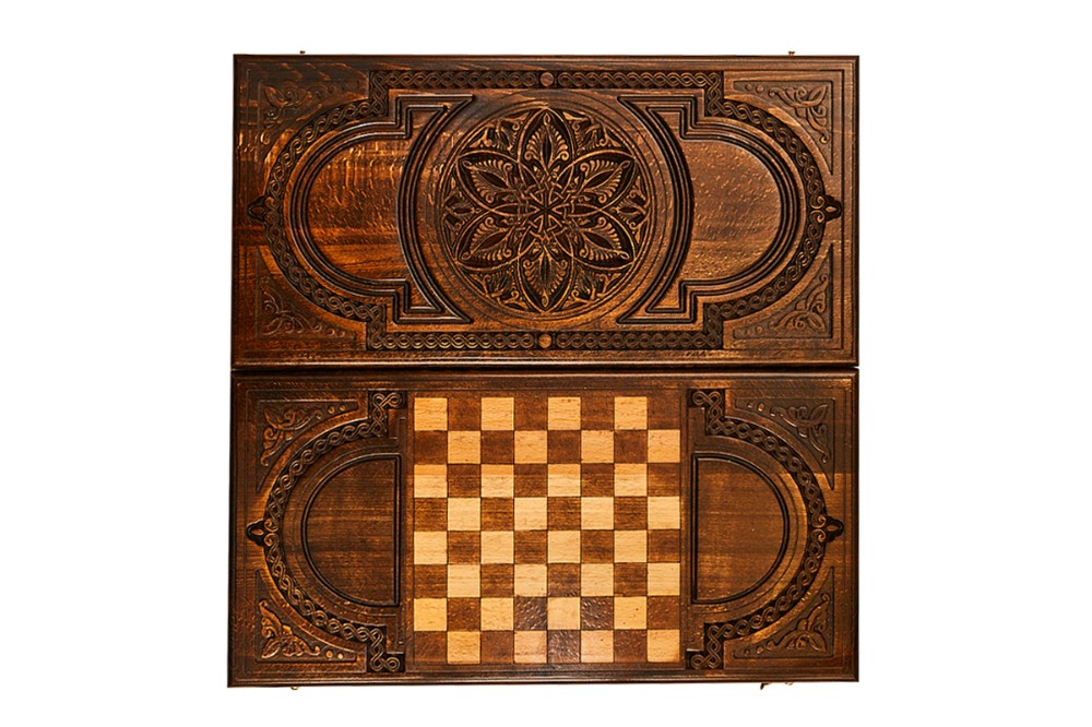 Автор использовал в качестве украшения интересный узор, названный армянским фракталом, который расположился в центре лицевой части. Его окружает аккуратная резьба по дереву, сочетающая различные фактуры, геометрические украшения и многое другое. На задней части предусмотрительно есть поле для игры в шашки. Изнутри нанесён рисунок, который подчёркивает центр и каждый из пазов для фишек. Древесная структура намеренно оставлена и даже подчёркнута, так как придаёт игровой поверхности своеобразной уникальности.