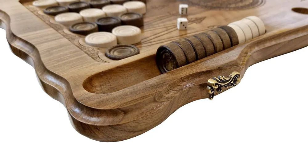 Доска дополнена медной фурнитурой. Она износостойка и прекрасно подходит для частой эксплуатации. Каждая фишка имеет бархатную подложку, благодаря чему они не царапают поверхность доски, передвигаясь по ней легко и плавно.