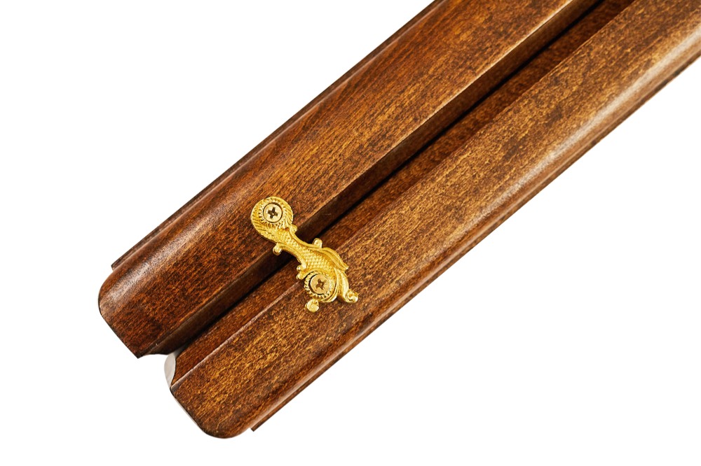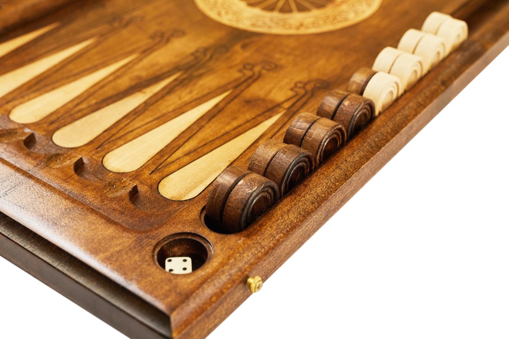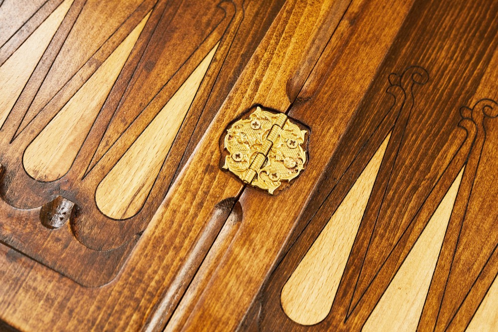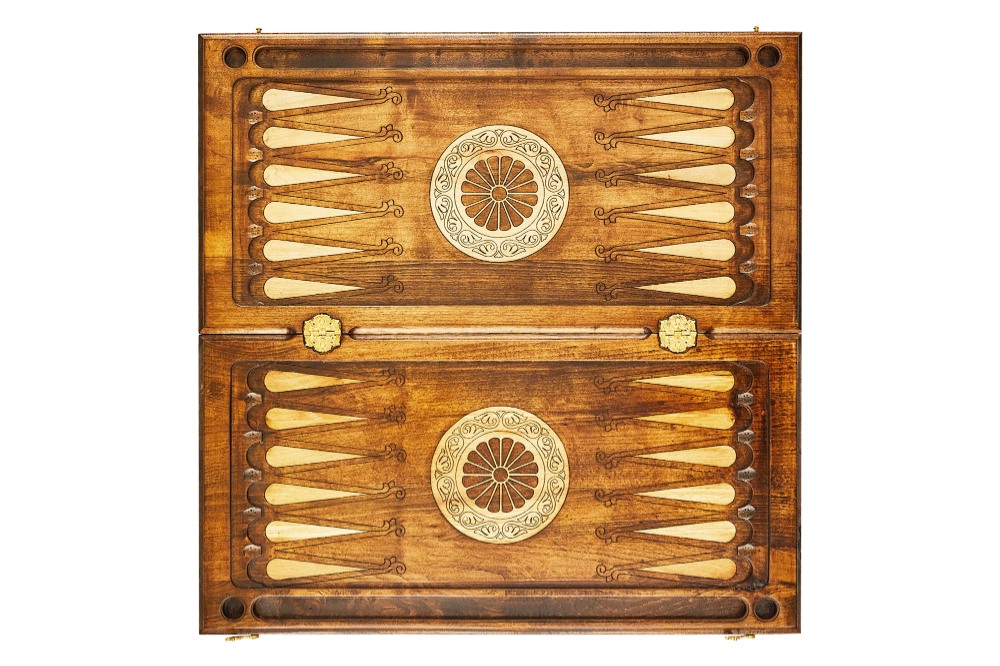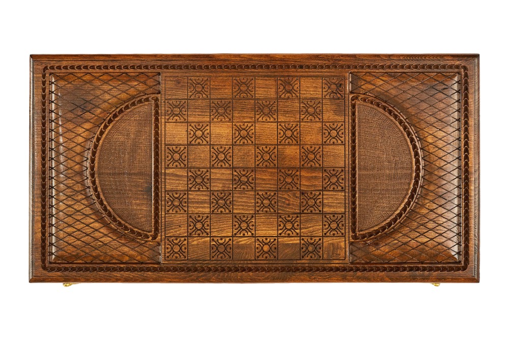 Верхняя крышка доски украшена резным изображением герба Армении. На задней крышке нанесено шахматное поле, поэтому данную доску можно использовать и для игры в шашки или шахматы. Внутренняя часть представляет собой поле для нард, украшенное красивыми узорами. Части доски скреплены надежной медной фурнитурой, поэтому она долговечна и устойчива к износу.