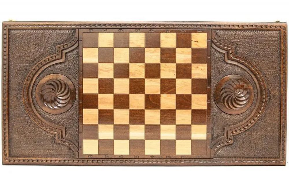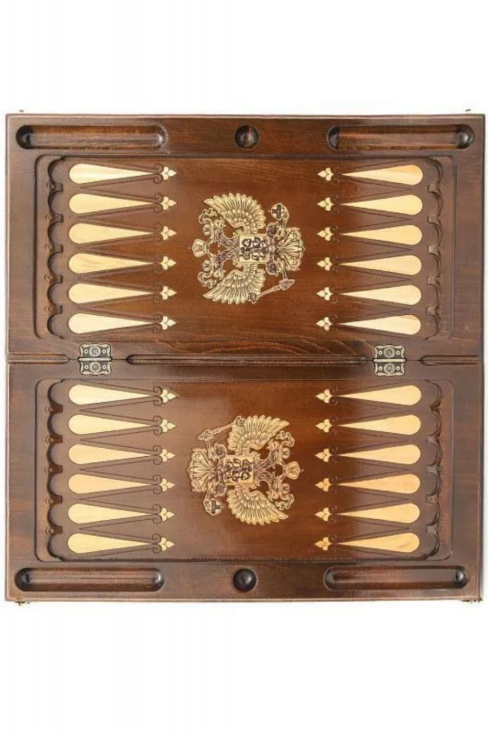 Верхняя крышка украшена резным рисунком национального символа РФ, а на задней нанесено поле для шашек. Внутри – нардовое поле. Каждая фишка в наборе имеет бархатную подложку, что предотвращает царапание поверхности доски.