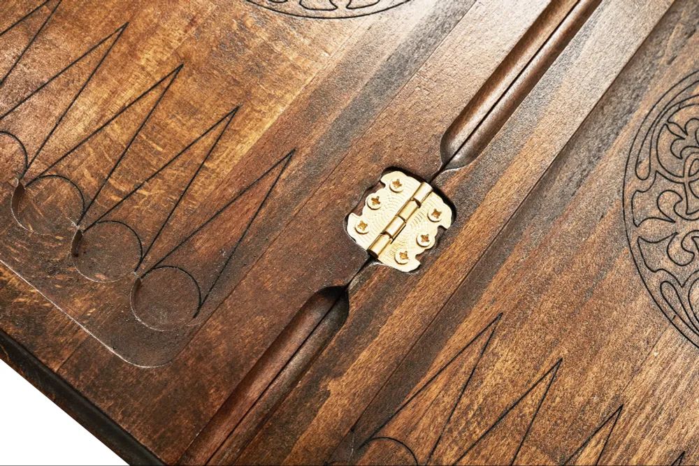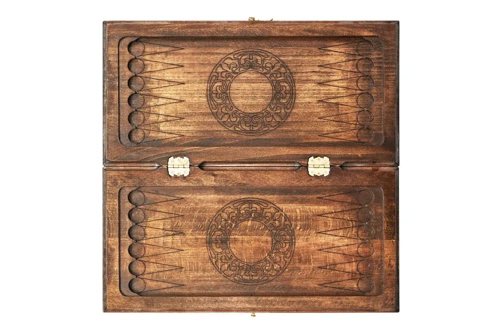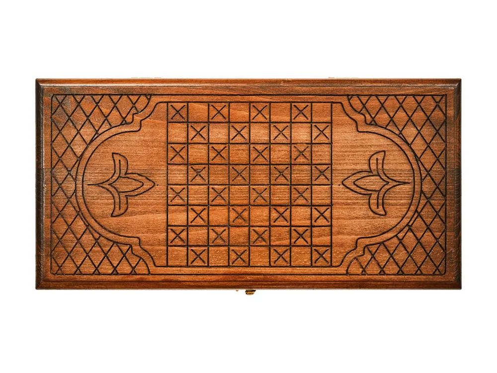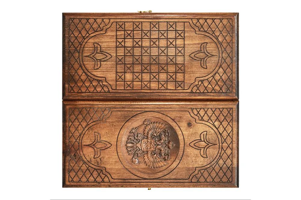 Резные нарды «Герб РФ-2» - игровой набор классических настольных игр, в который также входят шашки, поле для которых нанесено на заднюю крышку. Доска изготовлена из буковой древесины высокого качества, красоту фактуры которой подчеркивает защитный лак. Части доски скреплены между собой надежной медной фурнитурой. На задней крышке вырезано поле для шашек, а передняя крышка украшена мастерски исполненным изображением российского герба.
