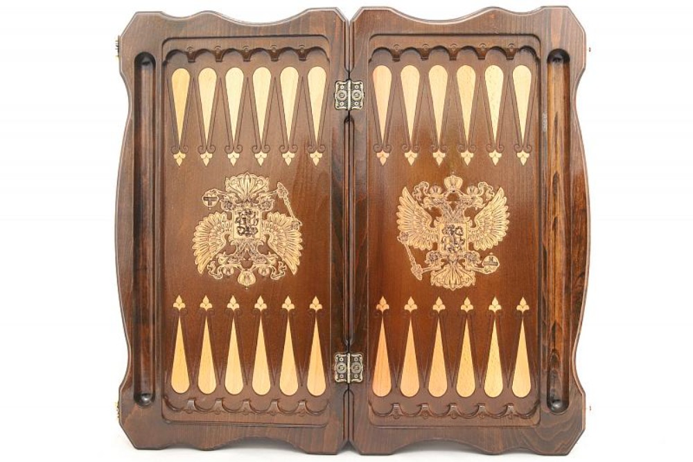 Подарочные нарды «Герб РФ 2», изготовленные талантливым мастером – прекрасный вариант пополнения личной коллекции классических настольных игр или как подарок. Модель выполнена из благородной буковой древесины с ручной резьбой и качественным лаковым покрытием. Верхняя крышка украшена изображением герба Российской Федерации, а также абстрактными резными узорами, присутствующими и на других частях доски. Оборотная внешняя сторона – поле для игры в шашки.
