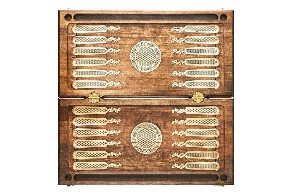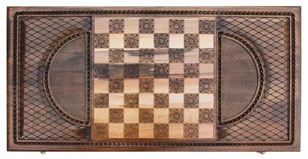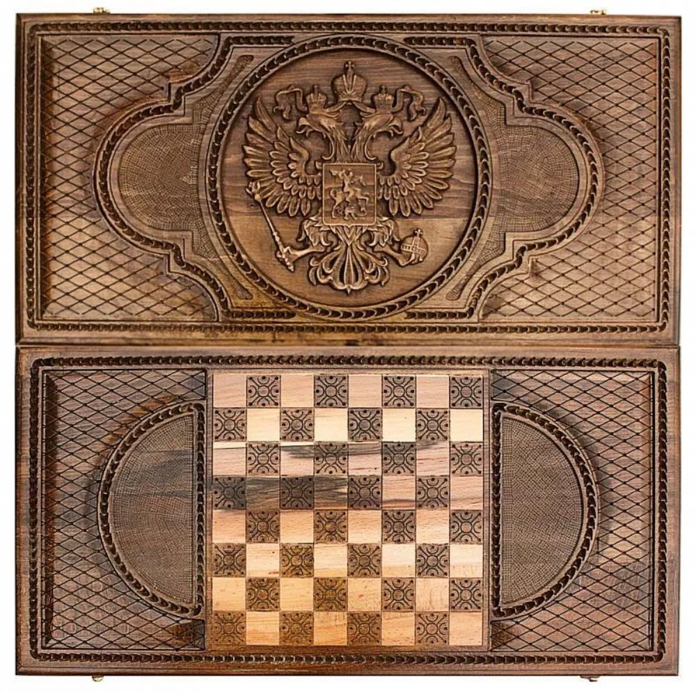 Доска сделана из натуральной древесины высокого качества. Верхняя крышка декорирована рельефным изображением герба РФ и красивым узором. Нижняя крышка – поле для шашек. Разворот полностью отведен под нардовое поле. Доска оснащена медной фурнитурой и защищена от царапин глянцевым лаком.