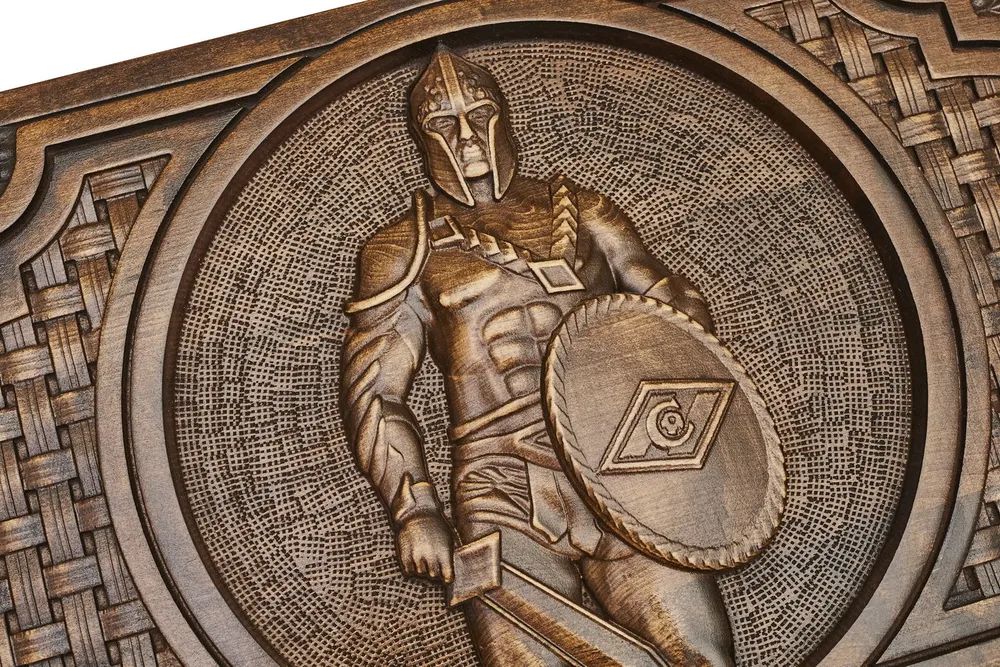 Для тех, кто ценит красоту и не собирается довольствоваться обычными изделиями, Давид Мхитарян изготавливает нарды резные «Гладиатор 1». Это не просто игровая поверхность, а настоящая картина, что становится видно уже при первом взгляде на переднюю створку. Тут в центре вырезан гладиатор, а вокруг него несколько типов узоров. Задняя сторона также вся в орнаменте, а середину занимает шашечное поле.