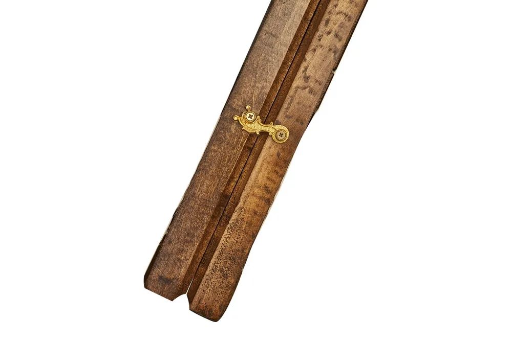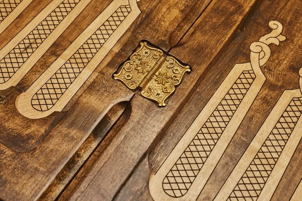 Изготовлена доска из бука, который сочетает в себе - прочность, долговечность, удобство при вырезании мелких элементов. Створки скрепляются при помощи петель из чистой бронзы, а закрываются крючком из этого же материала. Причём они выполнены в едином стиле со всем остальным. В комплекте есть необходимое количество фишек, а также чехол из мягкой ткани для хранения и транспортировки.