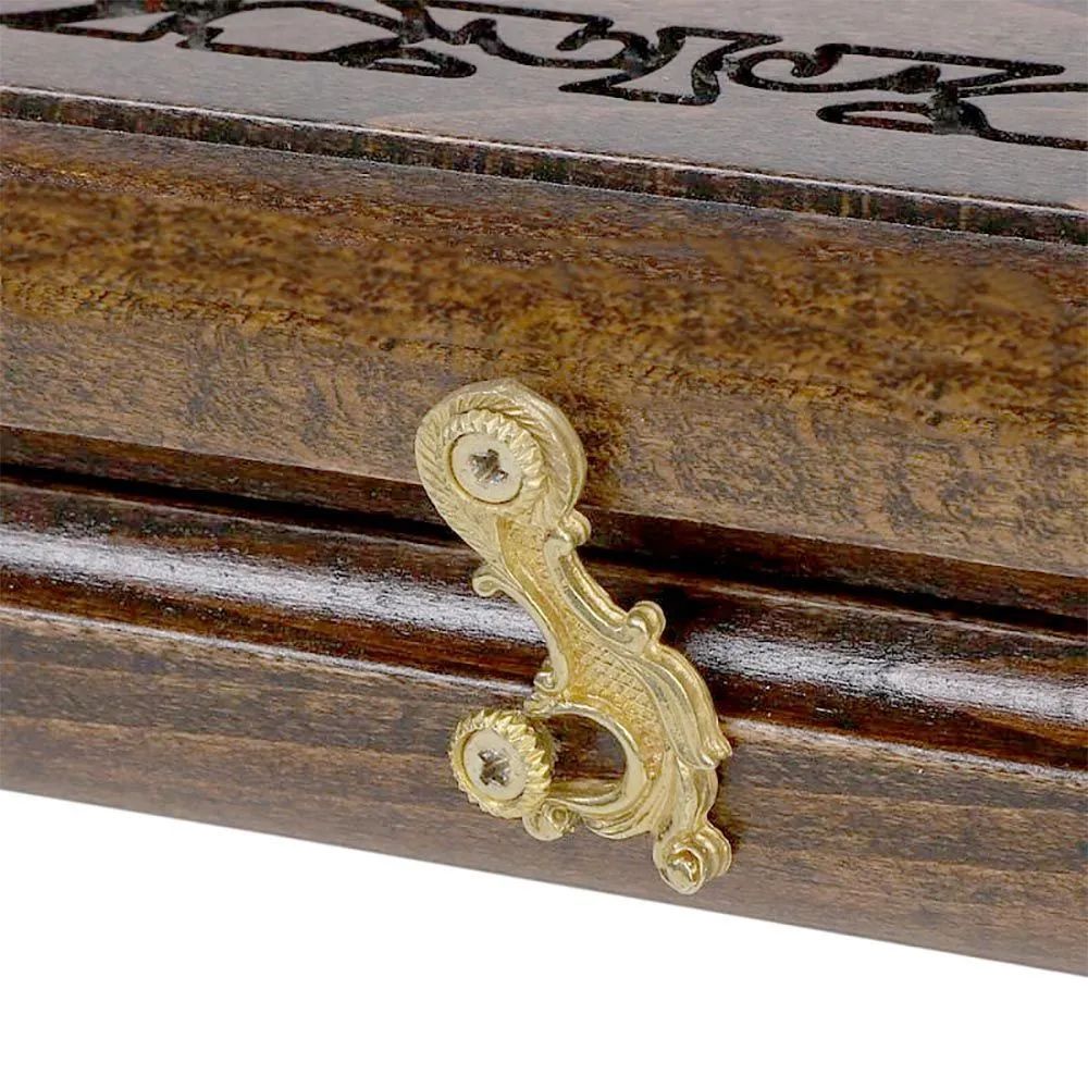 Вначале создатель выбирает материал - в этом случае это орешина. Данная древесина отличается множеством положительных качеств - не иссыхает на протяжении долгого времени, выдерживает достаточное механическое усилие, легко поддается обработке. Григорий Устян придумал интересное решение - здесь узоры расположены только по углам, а в середине остается гладкая поверхность с элементами деревянной структуры. Изнутри все также достаточно скромно - радиальное украшение по центру и небольшие отметки на каждой отдельной ячейке.