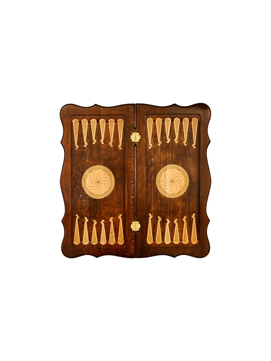 Чтобы доска прослужила долгое время, материалом для неё послужил бук. Он обладает достаточной надёжностью, чтобы выдерживать тысячи партий, а к тому же его древесная структура смотрится максимально эффектно. Комплектные фишки и кости позволяют сразу приступать к партии, как только соберётся компания друзей.