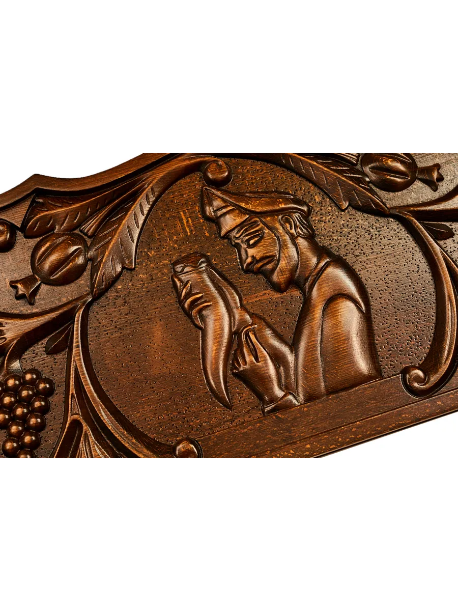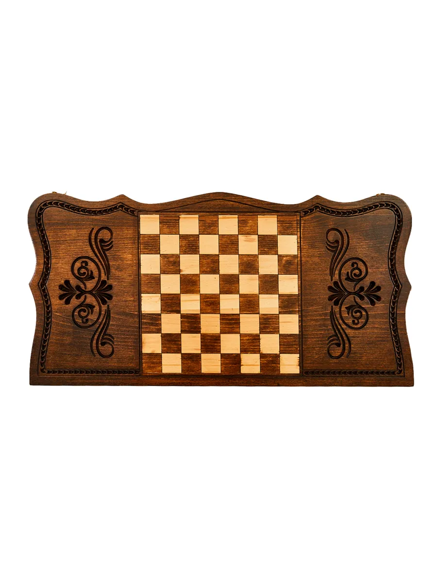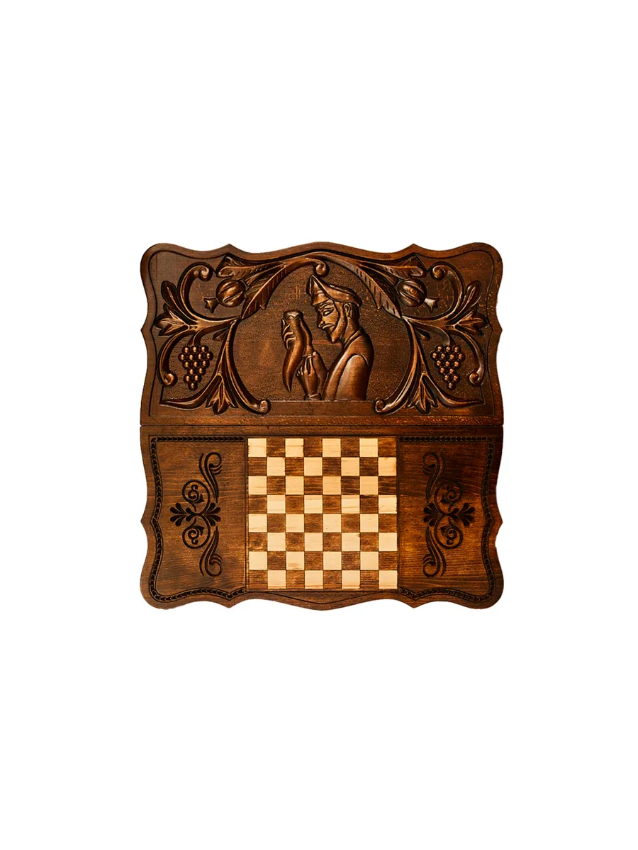 Игровая поверхность украшена номинальным изображением одного из представителей армянской народности, окружёна подобием рамки из лоз винограда и гроздей. Причём это настоящая резьба по дереву, благодаря которой создаётся эффект 3D-изображения. Сзади имеется поле для шашек, украшенное фигурным рисунком. Изнутри узор подчёркивает центральную часть и каждый из пазов. Даже петли и крючки были вылиты из металла в специальных узорчатых формах.