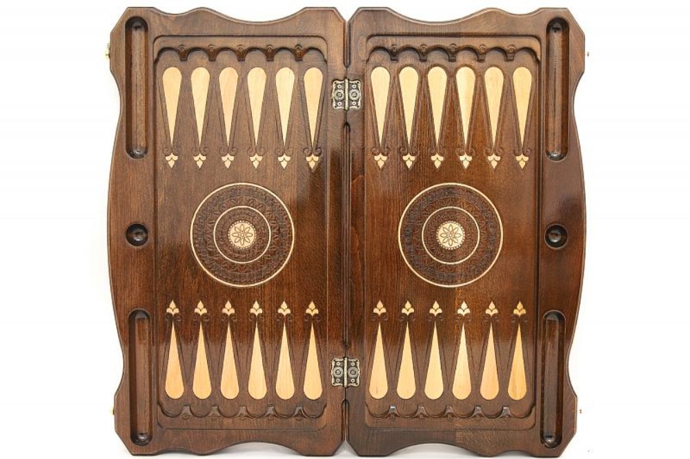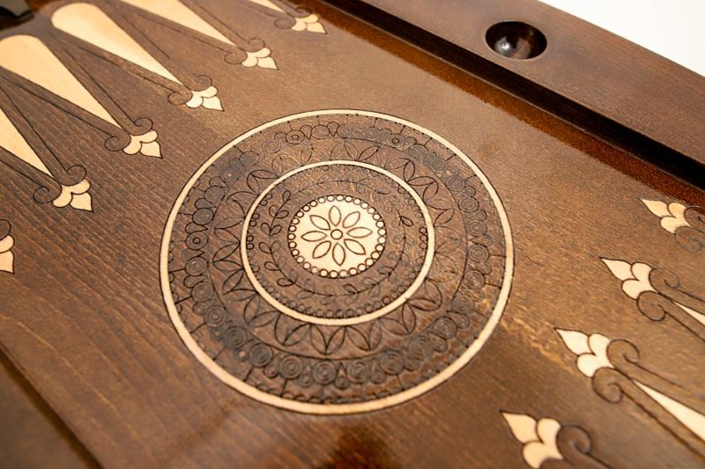 «Летящий Орел 2» – коллекционный набор нард, изготовленных одним из самых известных современных мастеров из натуральной буковой древесины высокого качества. Доска с внешней стороны украшена резным изображением орла в полете и абстрактным узором, который также переходит на заднюю внешнюю и внутреннюю часть доски. Кроме поля для нард здесь нанесено поле для игры в шашки.