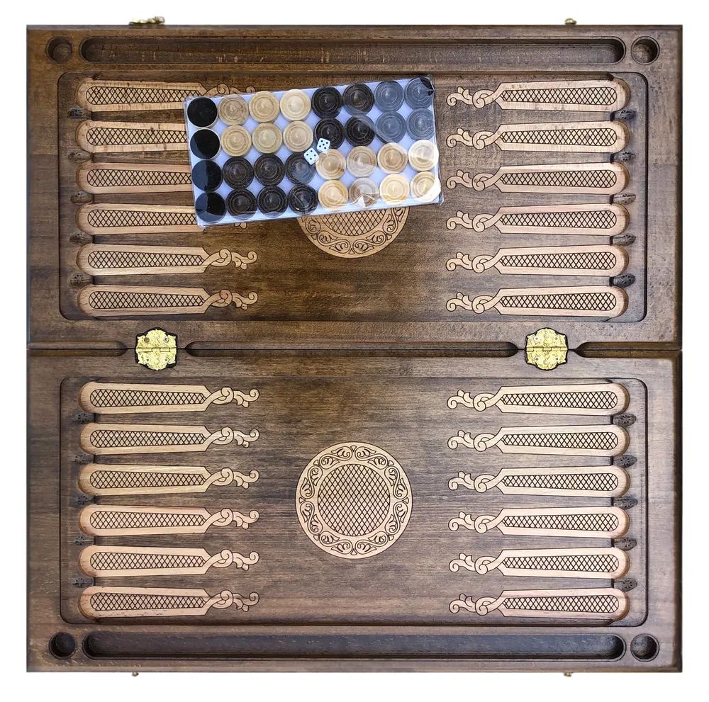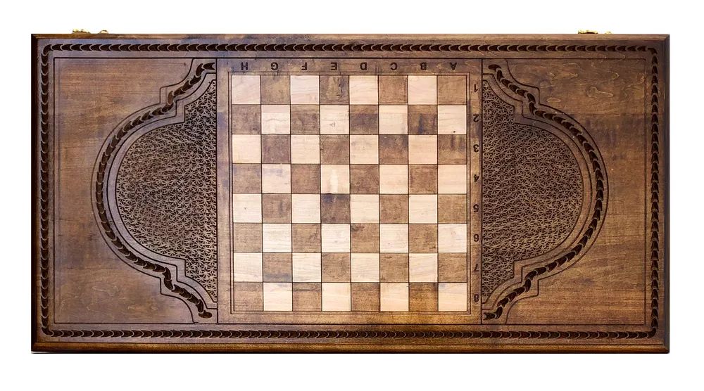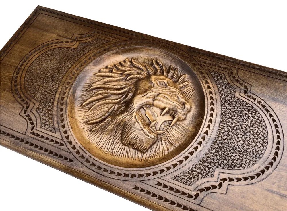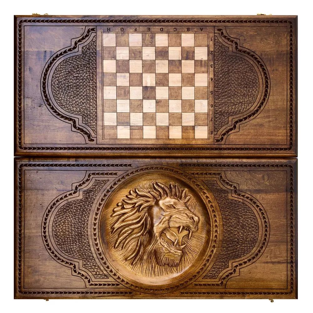 Доска, украшенная резным изображением головы льва с раскрытой пастью, покрыта защитным лаком. Он предотвращает образование царапин и потертостей. Дополняет доску, на задней крышке которой нанесено поле для шашек, медная фурнитура, устойчивая к износу.