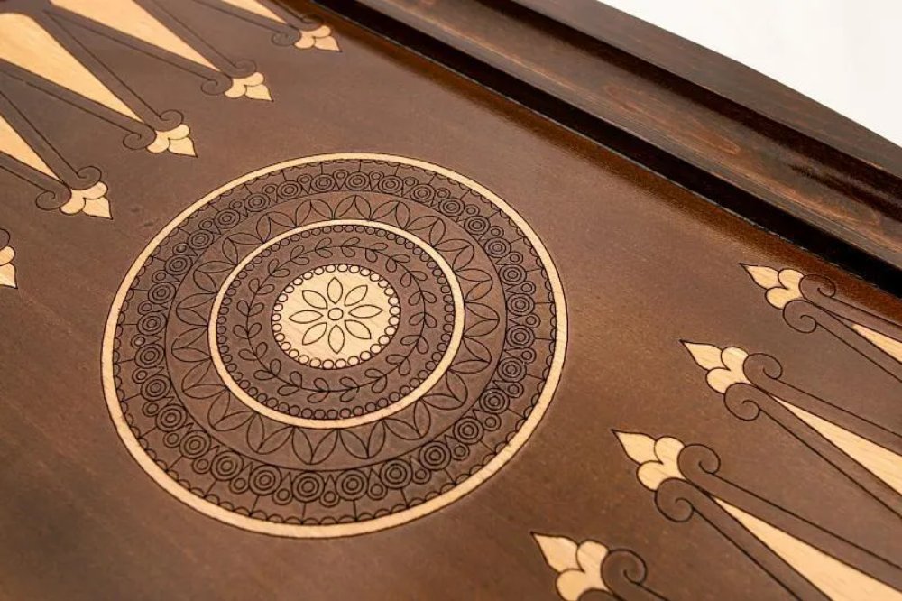 От появления царапин доску защищает глянцевый лак по всей поверхности, а также бархатные подложки на каждой фишке. Фурнитура из настоящей мели крепка, надежна, устойчива к износу, поэтому использовать этот набор для игры можно часто и без опасений.