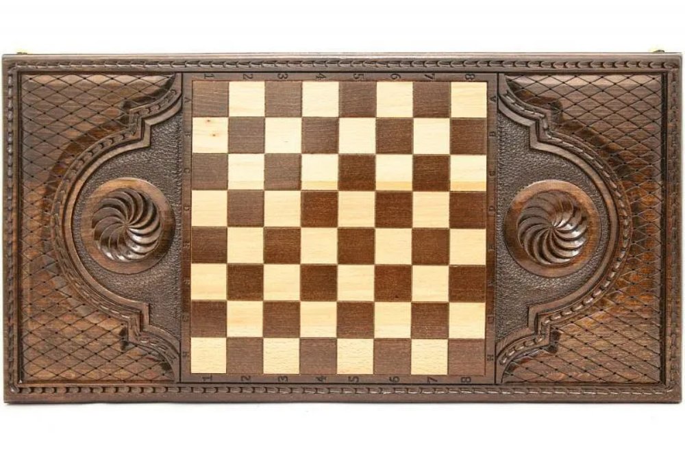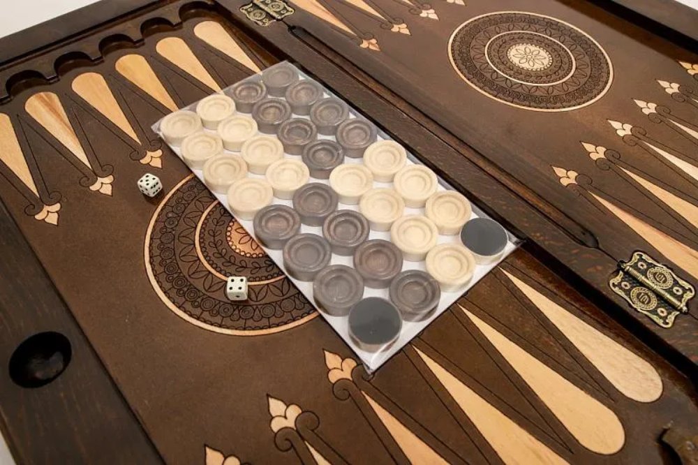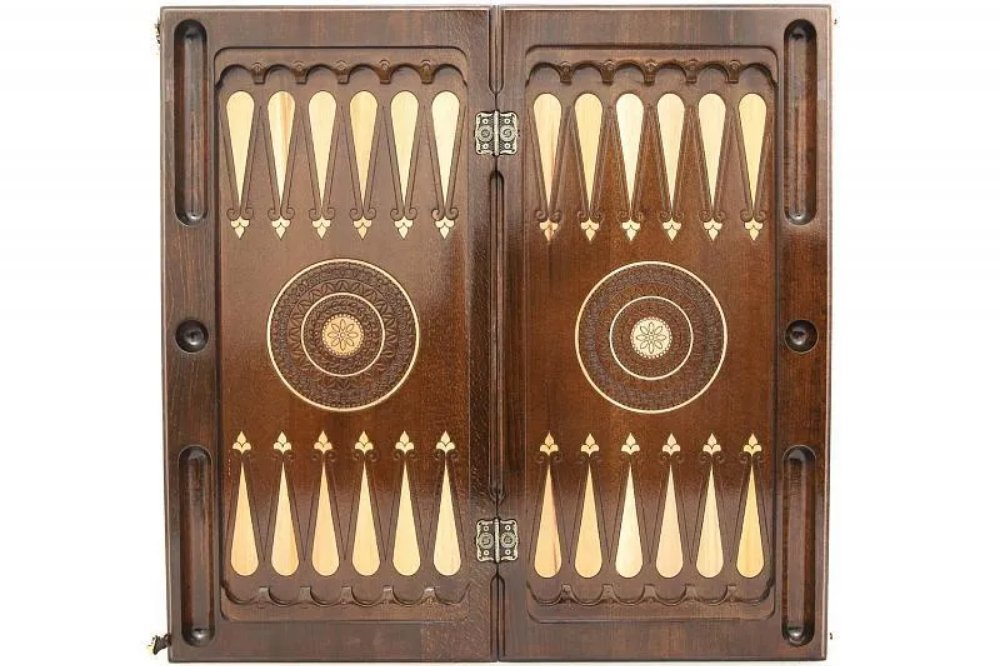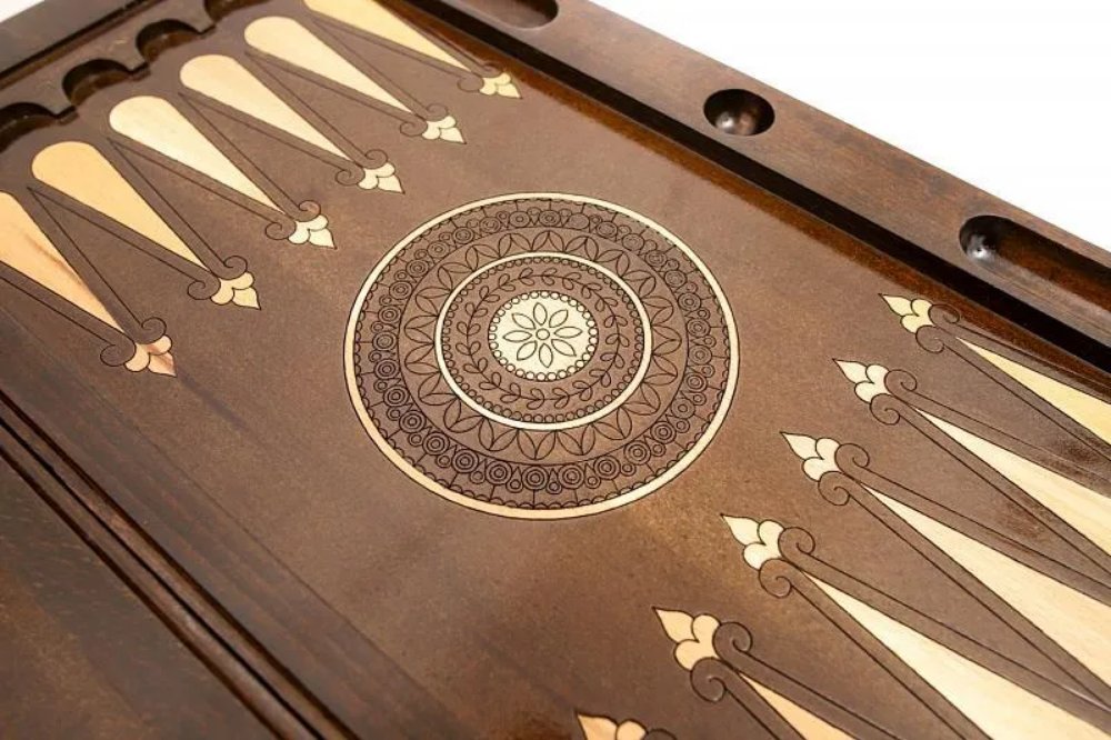 Доска изготовлена из благородной буковой древесины. Крышка украшена необычным для этой игры изображением оленей, отдыхающих на лесной опушке. С обратной внешней стороны нанесено поле для шашек. Внутренняя сторона доски – традиционное нардовое поле, которое тоже дополнено витиеватыми узорами. Фишки с бархатными подложками, что предотвращает царапание поверхности доски.