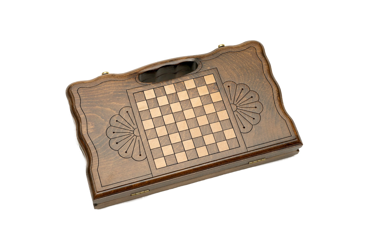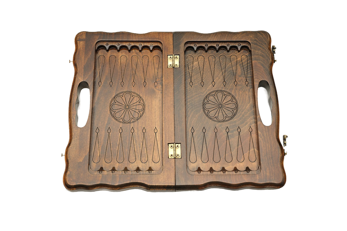 Внутренняя сторона – нардовое поле, украшенное витиеватыми узорами. Части доски скреплены между собой надежной фурнитурой из натуральной меди. Для защиты от царапин доска покрыта слоем глянцевого лака.