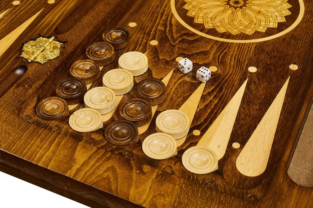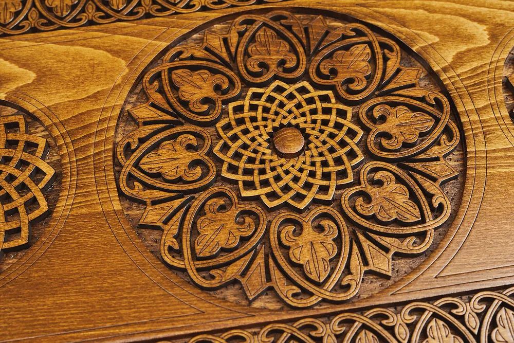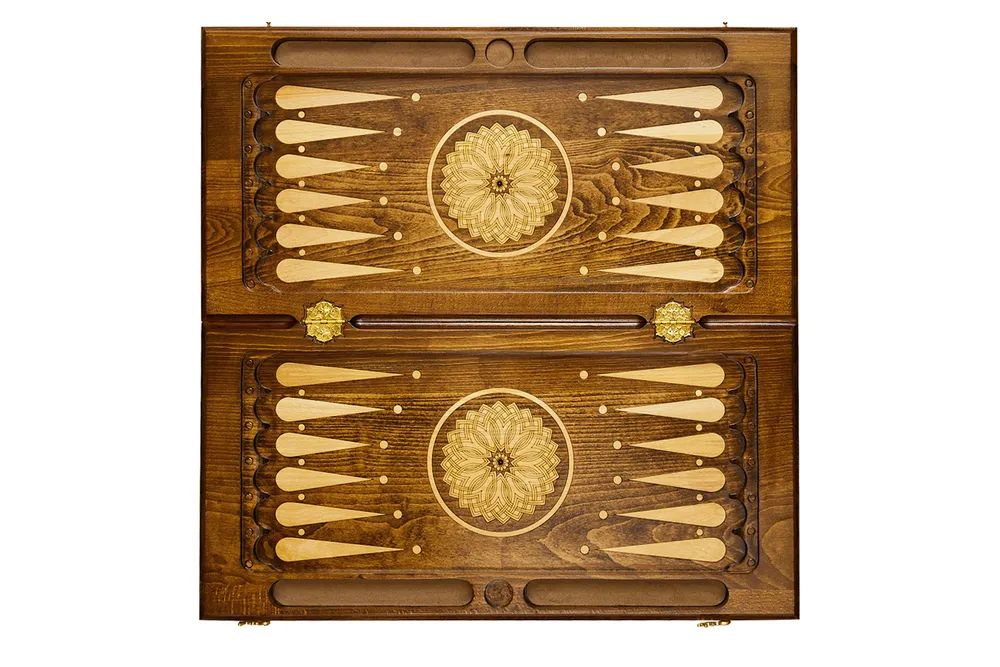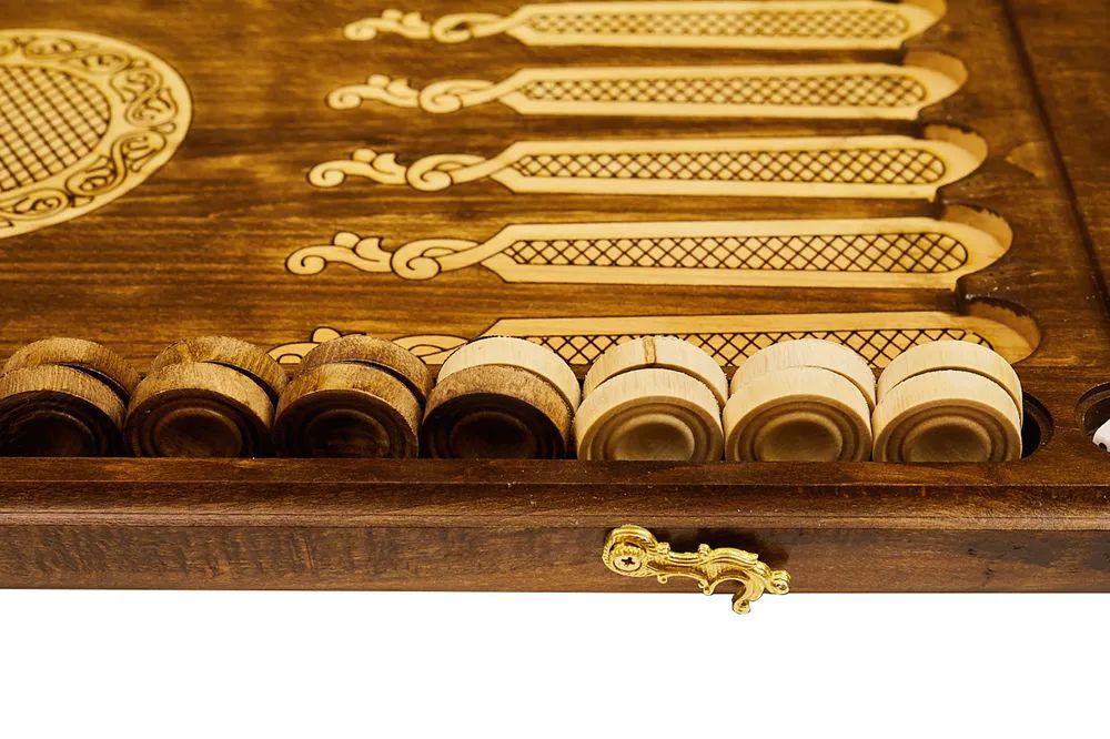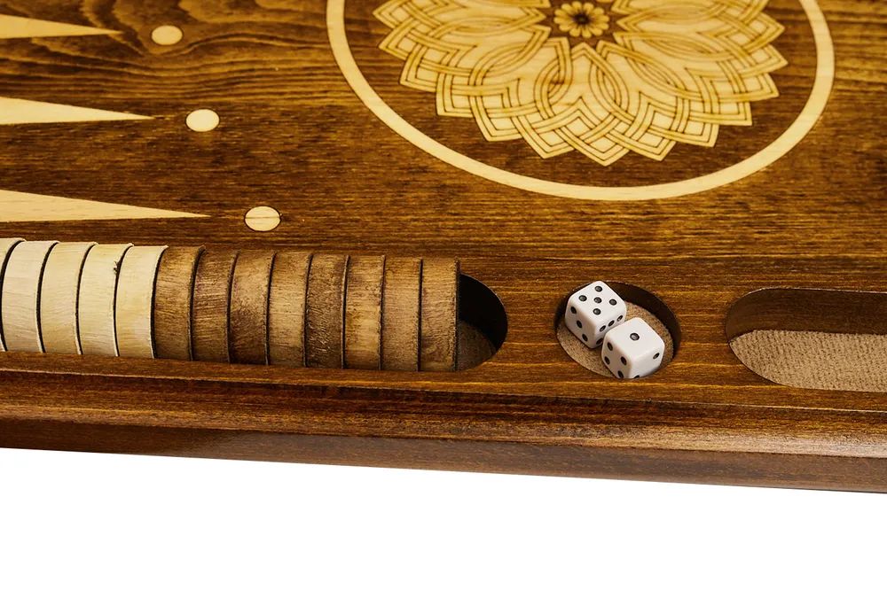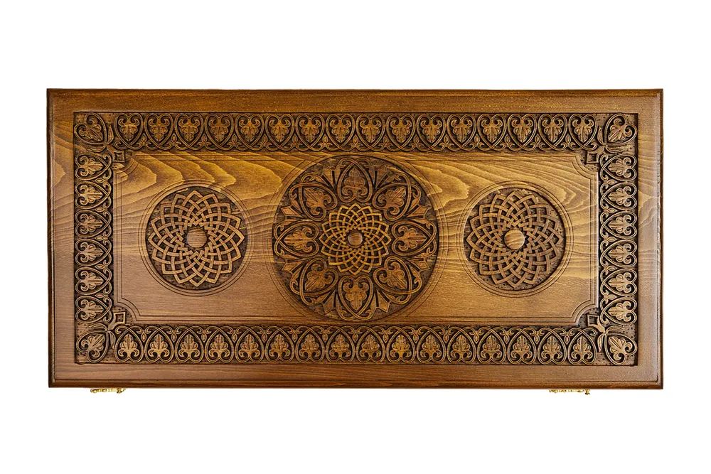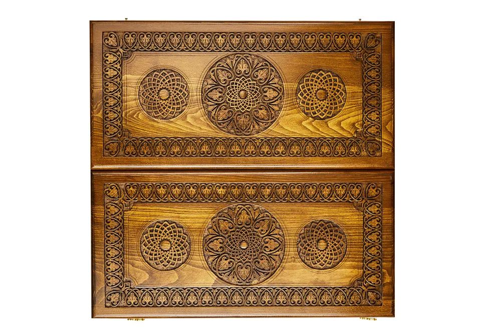 Подарочные резные нарды “Орнамент 2”, сделанные из прочной и красивой древесины бука - элегантное украшение для любой коллекции классических настольных игр. Части доски, украшенной изысканными узорами, скреплены между собой фурнитурой из натуральной меди. Сама же доска покрыта защитным лаком, предотвращающим появление царапин. На каждой фишке прикреплена бархатная подложка, что также предотвращает появление царапин в процессе игры.