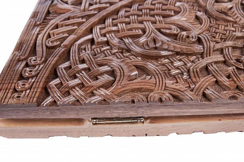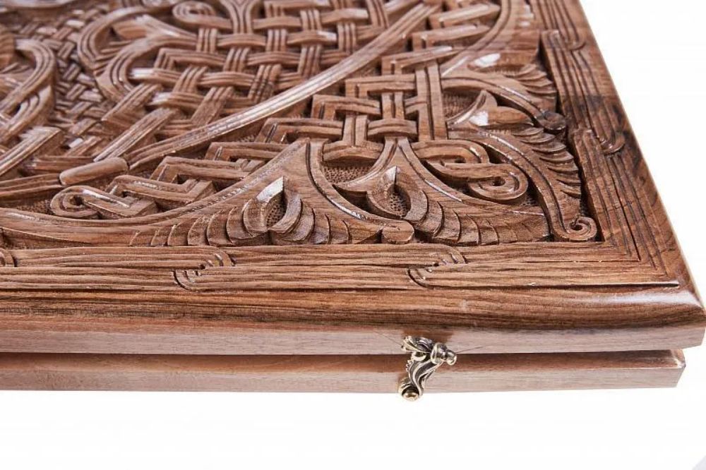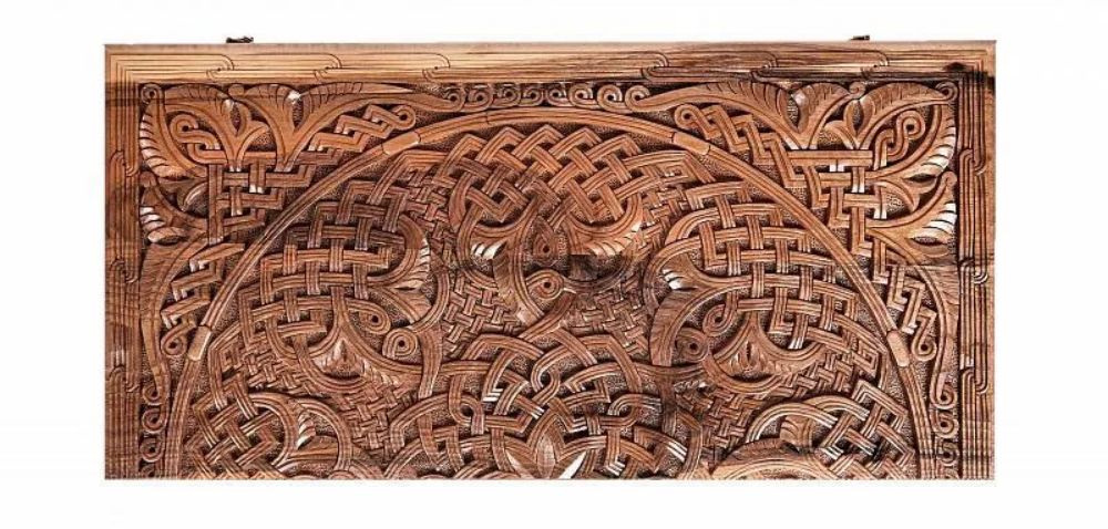 Особенностью нард резных «Орнамент 3» с цельным рисунком» является то, что узор с одной створки плавно перетекает на другую. В открытом виде создаётся цельная картина, что является заслугой мастера из Армении Давида Мхитаряна. Это полностью ручная резьба, выполненная с вниманием к мельчайшим деталям, благодаря чему и достигается настолько интересный внешний вид.