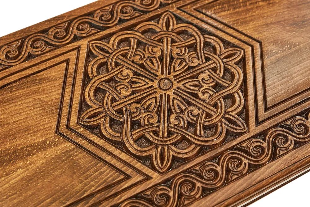 Резные нарды «Шестигранный узор» - эксклюзивная ручная работа известного армянского мастера. Подарочный набор из двух традиционных настольных игр - нард и шашек, поле для которых расположено на оборотной внешней стороне. Доска, сделанная из натурального массива бука, скреплена надежными и износостойкими бронзовыми петлями, поэтому о ее долговечности можно не беспокоиться. Кроме того, каждая из фишек в комплекте имеет подложку, призванную защищать доску от царапания во время игры. Также в комплект входит пара костей.