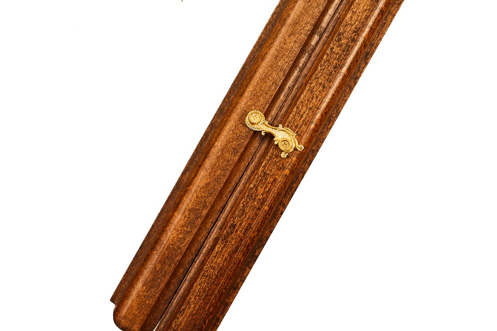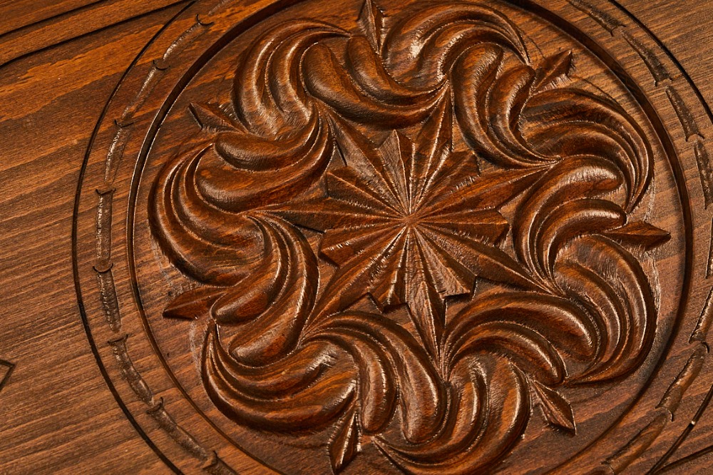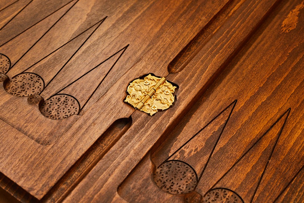 Внутри всё менее изысканно, но всё равно красиво. Та же древесная фактура, в центре находится геометрический узор, а по краям вырезаны лунки для фишек, подчёркнутые каплевидным вырезом и фактурой. На металлических элементах, петлях и крючках, также нанесен рисунок. Использование буковой древесины позволяет быть уверенным в прочности игровой доски, и её долговечности.