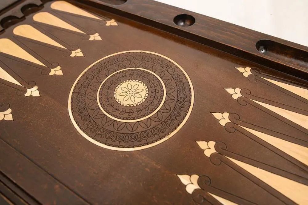 Буковая древесина, из которой сделана доска, украшена абстрактными резными узорами и изображением скорпиона. На обратной внешней стороне также имеется поле для игры в шашки, и в комплекте есть для этого полный комплект фишек. Доска покрыта защитным лаком и дополнена износостойкой фурнитурой из натуральной меди.