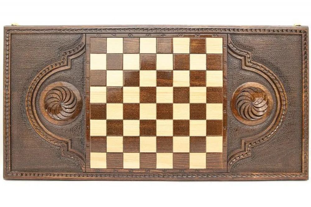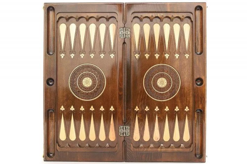 Внутренняя часть доски - поле для игры в нарды, а сзади - поле для шашек. Доска скреплена медными петлями и покрыта защитным лаком. Фишки удобной формы хорошо лежат в руке. Каждая из них имеет бархатную подложку, что предотвращает царапание.