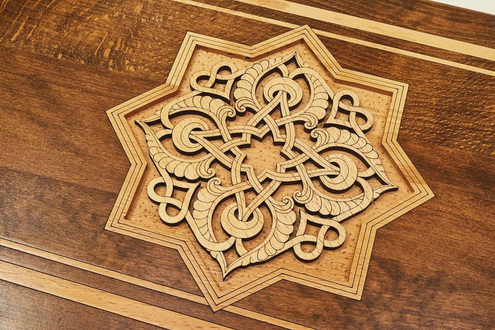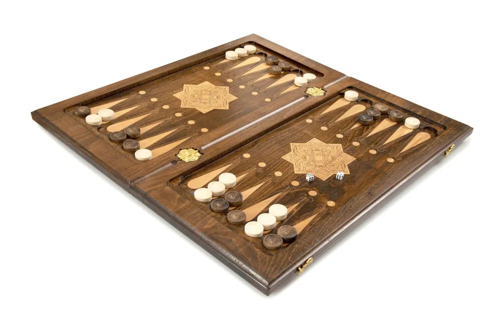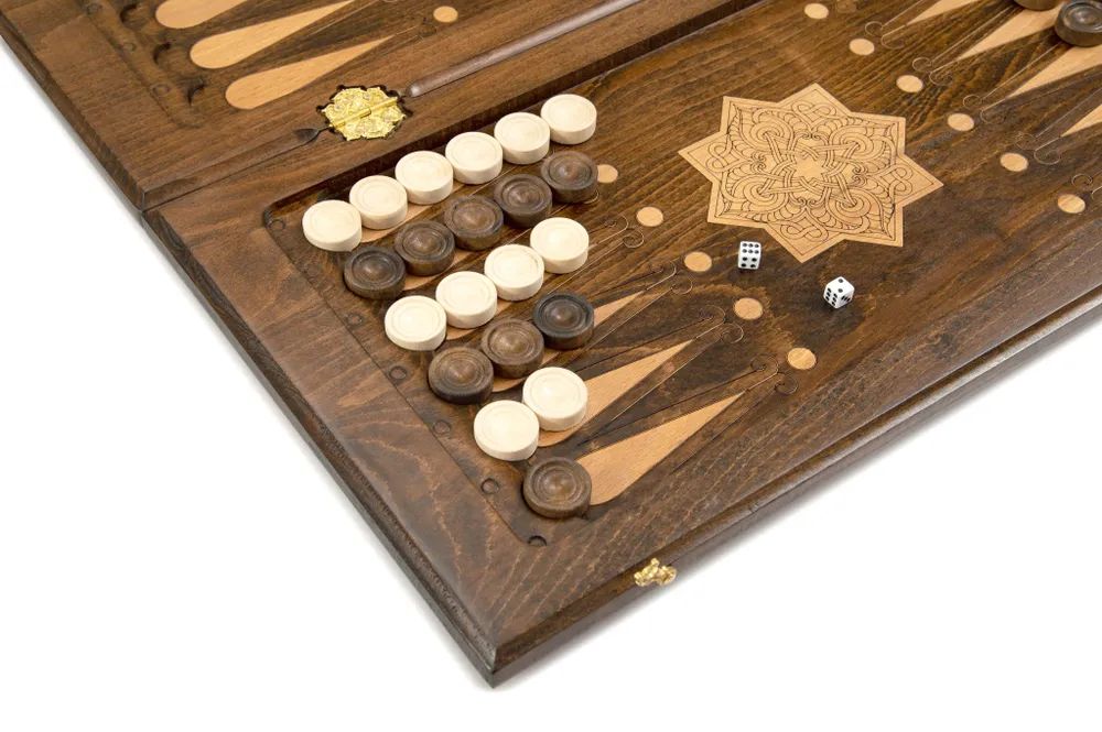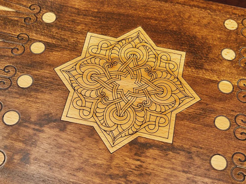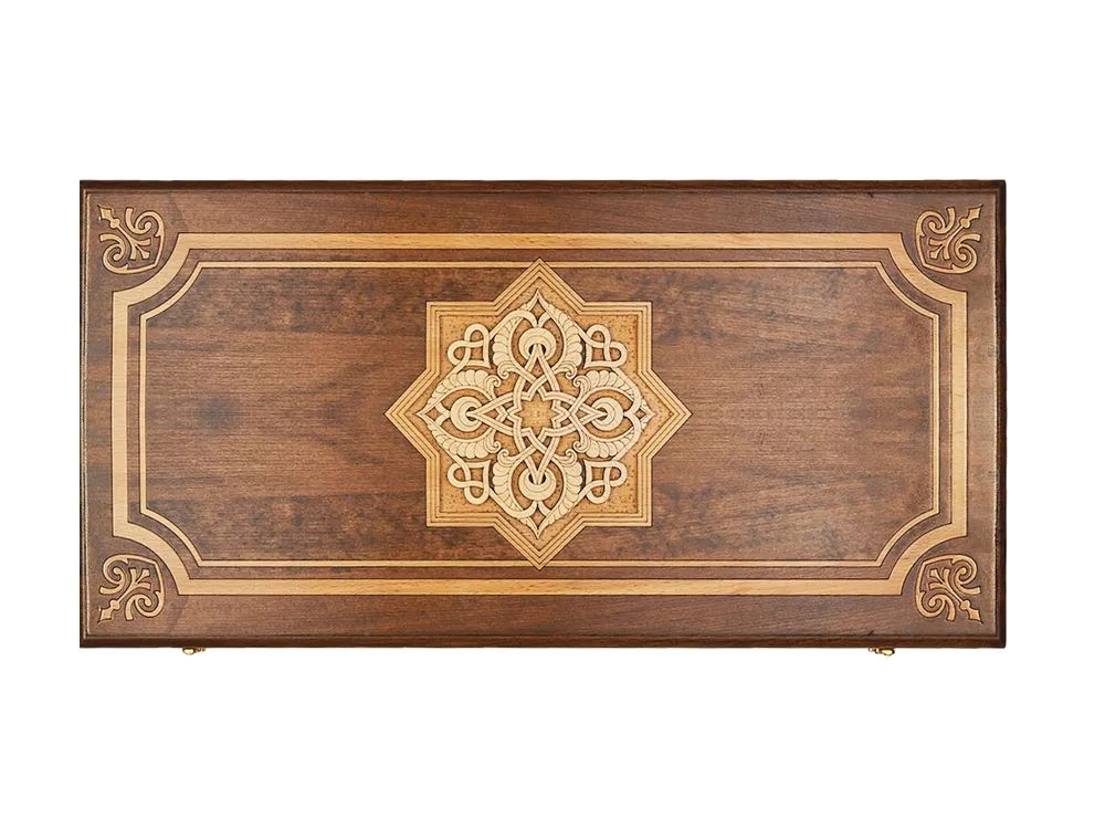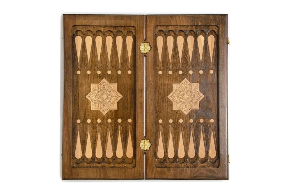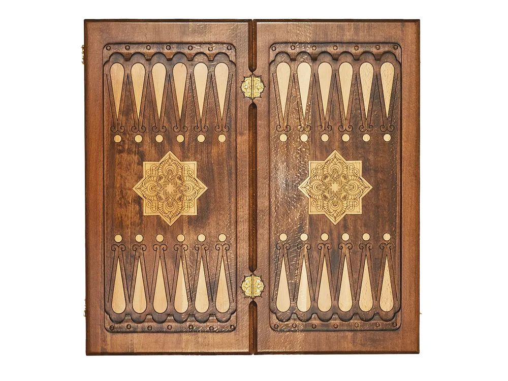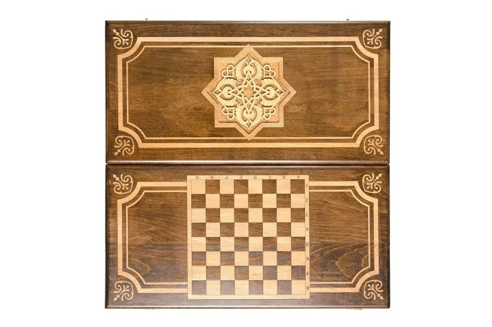Эксклюзивный набор для игры в нарды и шашки ручной работы. Набор выполнен из букового дерева. Верхняя сторона игровой доски обрамлена рамкой с украшениями по углам, по центру расположился орнамент из изумительно тонкой, ажурной резьбы в восточном стиле. На нижней стороне располагается шашечное поле. Внутренняя сторона предназначена для игры в нарды, она также украшена красивым орнаментом. Набор укомплектован фишками в количестве 32 штуки, разделенными на светлые и темные и двумя кубиками. Для сохранности предусмотрен чехол. Уникальная работа мастера превращает игровой набор в произведение искусства, которое оценят любители игры.