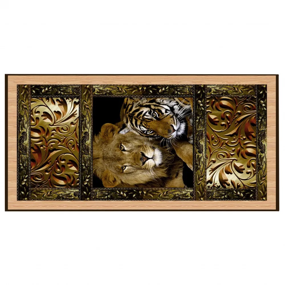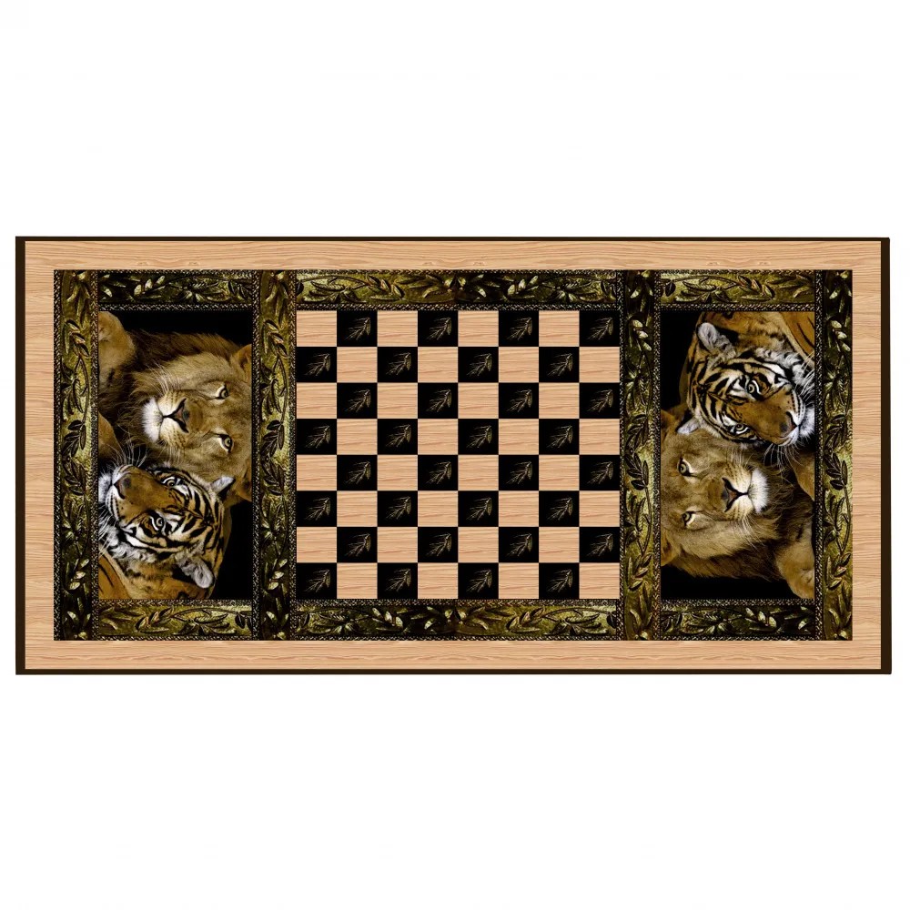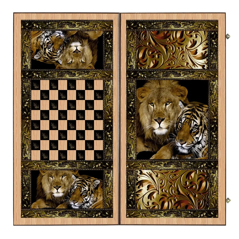 Нарды “Сирия львы” большие рассказывают нам об исторической родине нард - Индии. Изображение льва и тигра имеют особое значение в культуре этой страны: лев - обозначает отвагу и мудрость, образ тигра, священного животного, символизирует живость ума и выносливость. Композицию завершает обрамление золотистым узором.