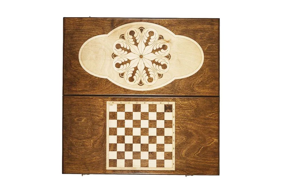 Утонченный, коллекционный набор для игры в нарды и шашки. Игровая доска из бука продемонстрирует всю красоту структуры дерева. Одна половина внешней стороны доски украшена золотой росписью в виде цветка, на второй стороне расположились шашечные клетки. Внутренняя сторона доски представляет собой поле для игры в нарды. В набор входят по 16 темный и светлых фишек и два кубика. Фишки имеют подложку, поэтому будут отлично скользить и не царапать поверхность игрового поля. Набор упакован в чехол для предотвращения повреждений и лучшей сохранности. Ручной труд мастера создал уникальную красоту из натуральных материалов, добавив в произведение восточной роскоши.