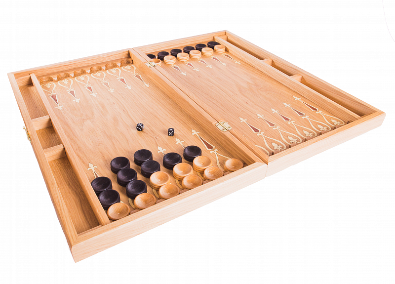 Верхняя часть доски, декорированной в технике шелкографии, полностью отведена под поле для шашек и шахмат. Внутренняя сторона представляет собой поле для нард, украшенное оригинальными узорами. Кроме того, там есть на бортах ячейки для удобного и безопасного хранения игровых элементов.