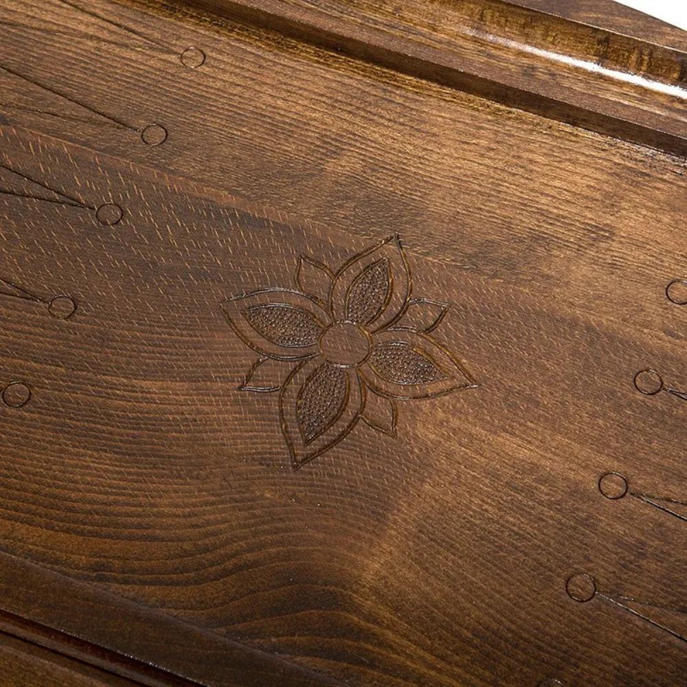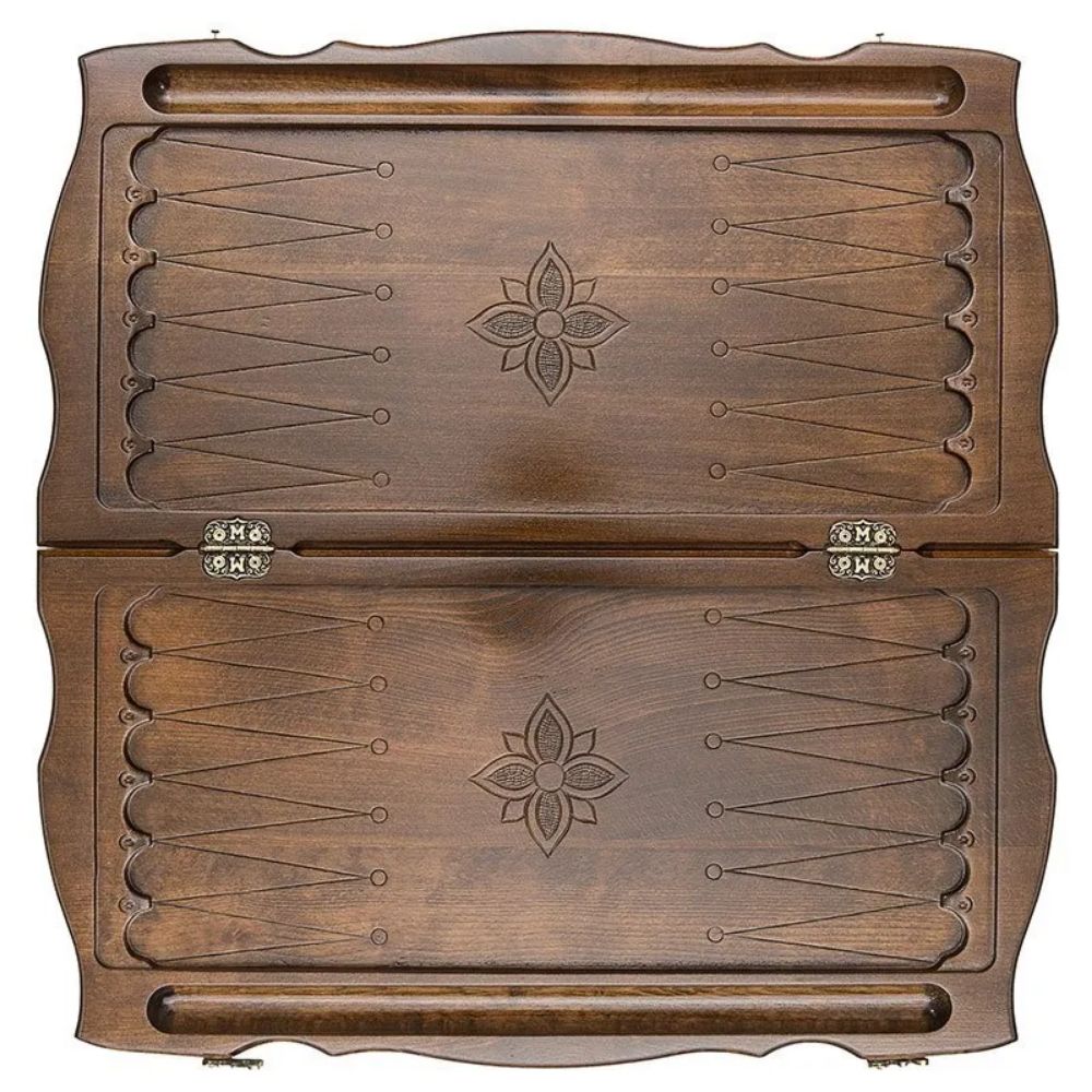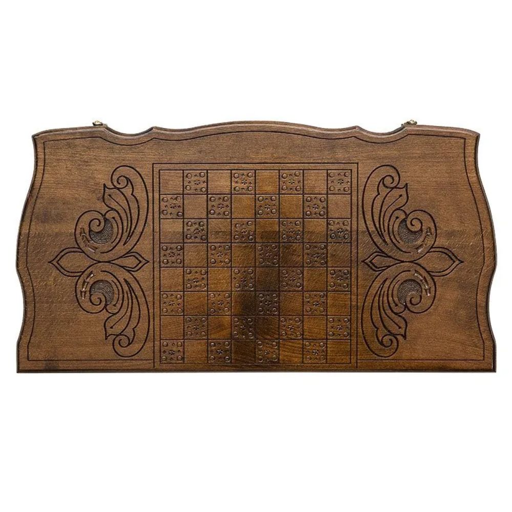 Внешний вид изделия имеет настолько же большое значение, что и качество изготовления. На лицевой части вырезается изысканный узор, причем есть как мелкие символьные элементы, так и крупные, напоминающие листья. В центральной части изображен герб Ингушетии, с очень глубокой детализацией. На противоположной стороне имеется отдельное поле 8х8 для игры в шашки. Внутренние поверхности украшены цветком в середине, а каждая отдельная ячейка обладает собственным мелким узором.
