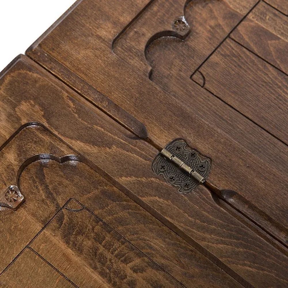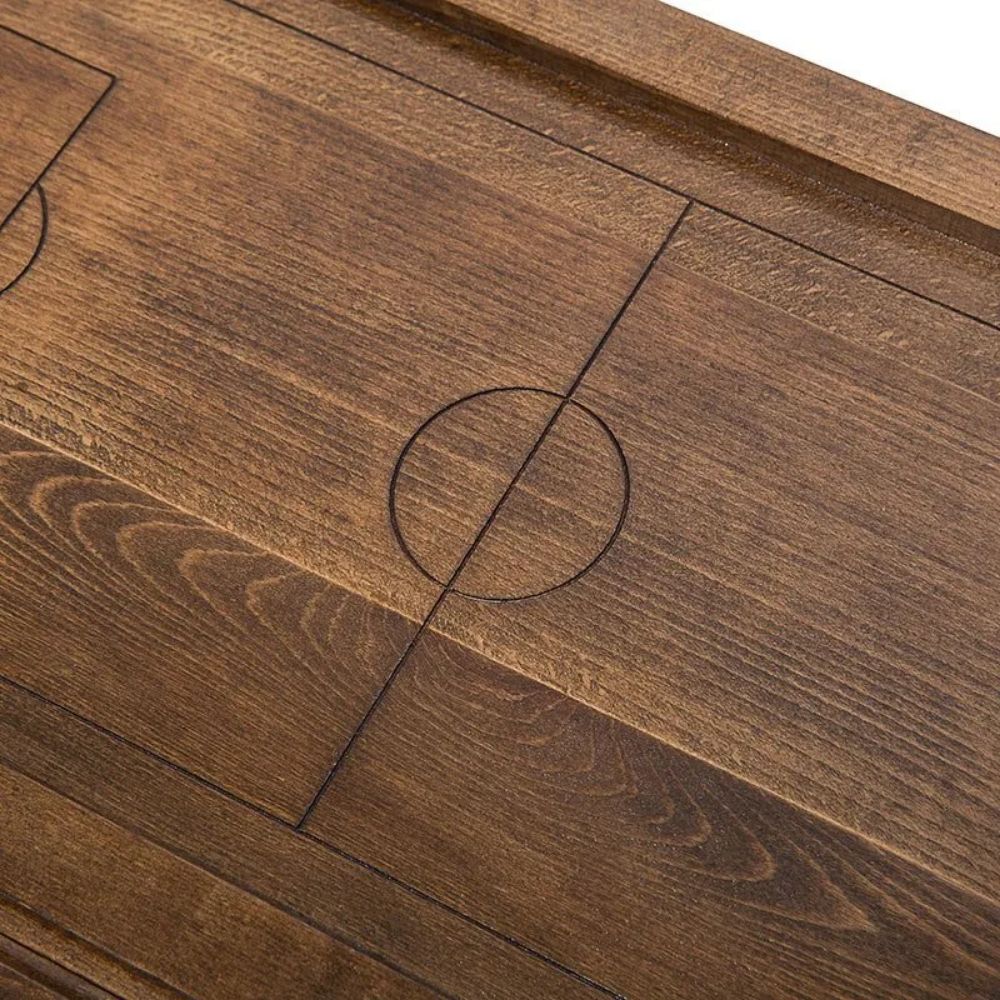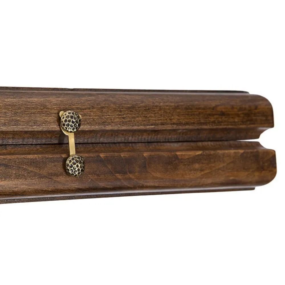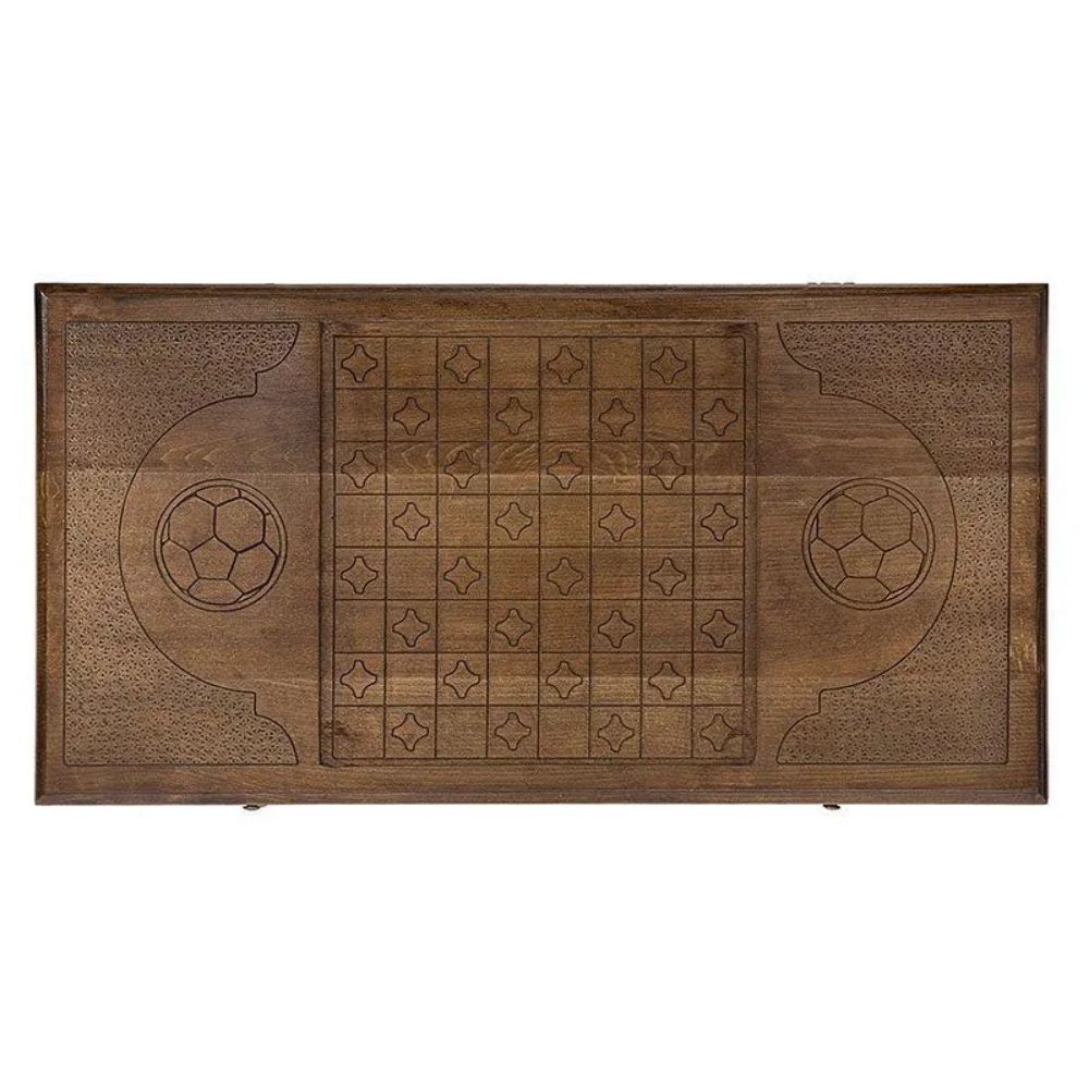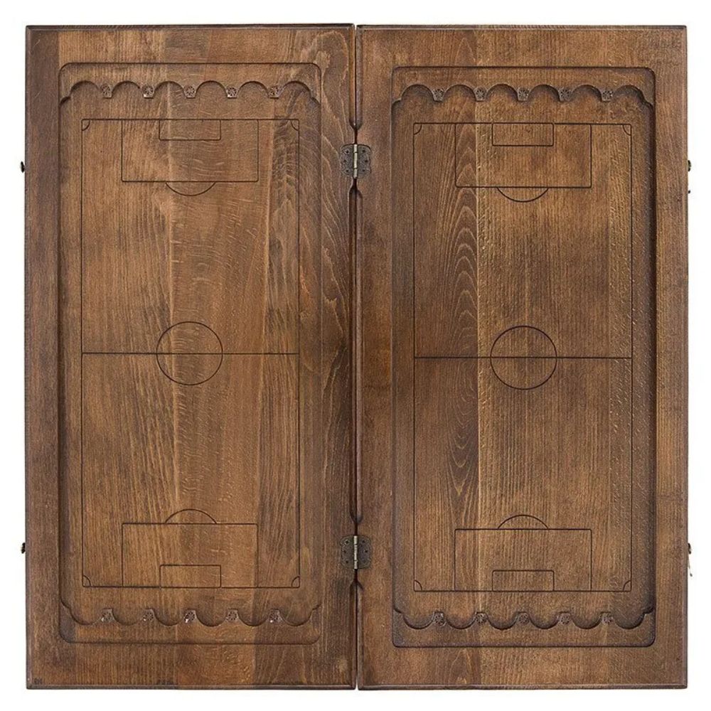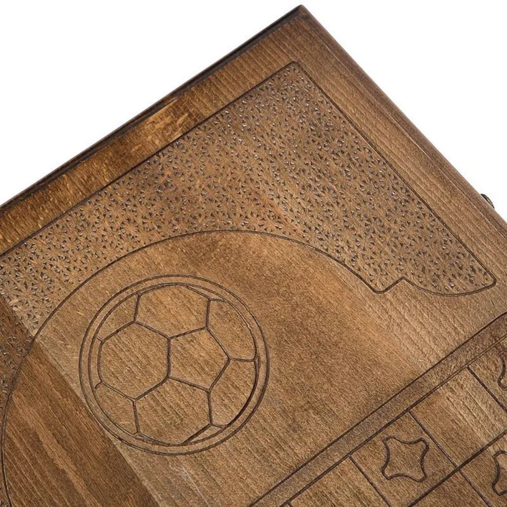Уже с первого взгляда видно, на что был сделан акцент, при выборе резьбы. Лицевая поверхность украшена эмблемой футбольного клуба, при чем, детализация здесь ничуть не уступает компьютерной графике. На обратной стороне вырезано поле для игры в шашки, размером 8х8 клеток, для которого можно будет использовать комплектные фишки. Изнутри, на каждой из створок, нанесена разлиновка, аналогичная футбольному полю. Металлические части также украшены узором и отлично вписываются в общую картину.