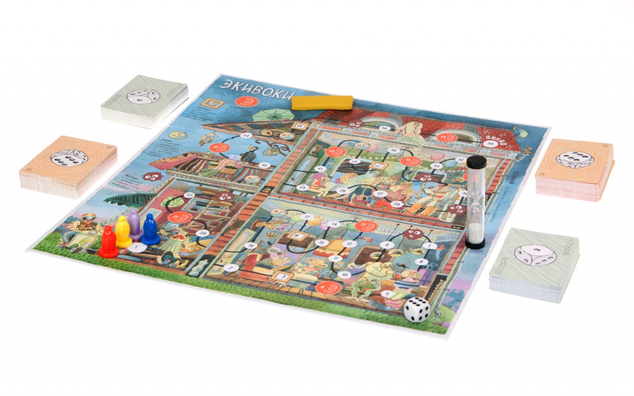 В начале игры нужно разложить поле, рядом - выложить 2 пачки карт с заданиями. Поставить фишки на старт, определиться, кто будет экивочить первым, и бросать кубик.