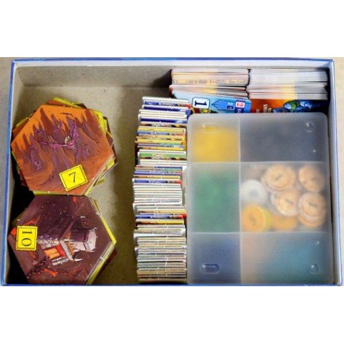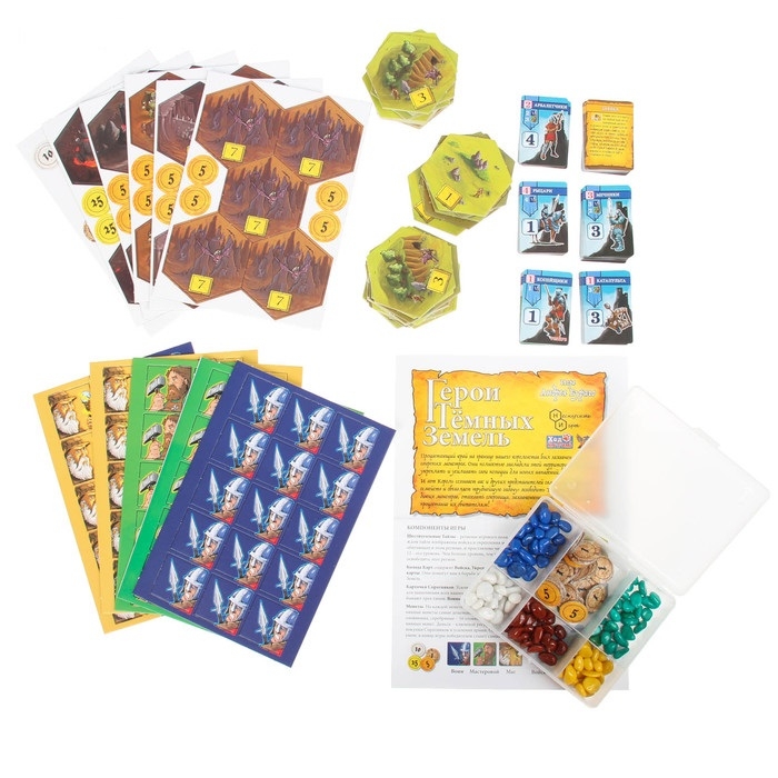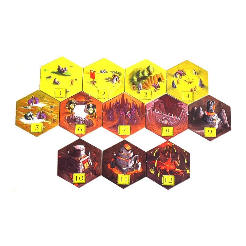 Поле состоит из гексов (шестиугольников), на которые нанесены части Местности, где и будут происходить сражения. Для того чтобы участник стал правителем одного гекса, необходимо поставить на него каточку Войско, чья сила будет выше прежней. Причем нужно помнить, что войска могут оказывать поддержку друг другу, о чем свидетельствуют цифры в центральной части карточки. Это основное правила, на котором и стоит разрабатывать собственную стратегию. Помощники в игре представлены 3 видами: Воины, Строители, Волшебники