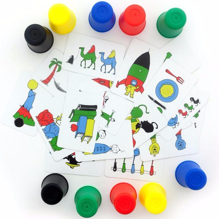 В центре стола находится колода, содержащая карточки с изображением - 5 объектов, 5 существ и так далее, аналогичных цветов. Открывается верхняя карта и игроки должны быстро рассмотреть картинку, чтобы определить порядок цветов и их расположение по горизонтали или вертикали. Теперь нужно, из выданных колпачков повторить это сочетание.