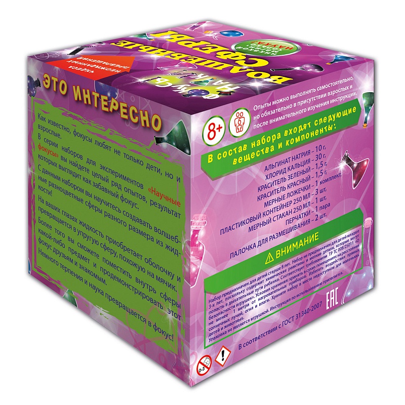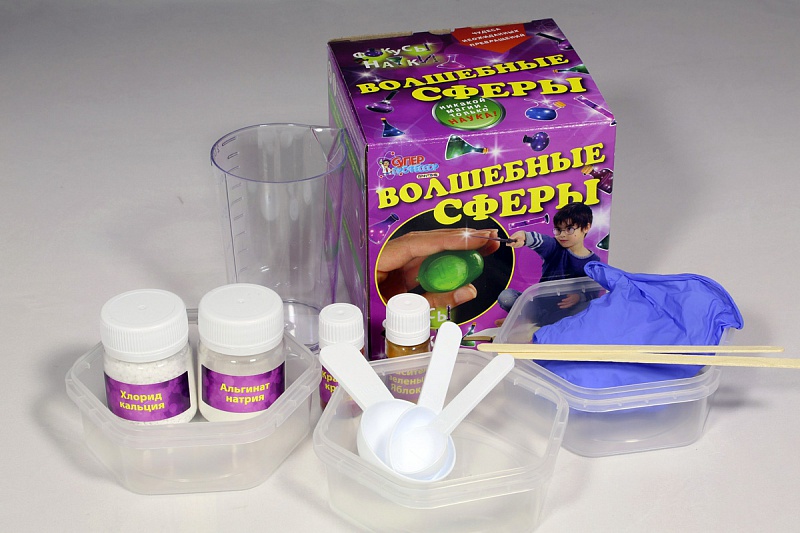 Набор для химических опытов «Волшебные сферы» наглядно продемонстрирует юным следопытам, как жидкость может переходить из одного физического состояния в другое, превращаясь в шарики разного цвета и размера. Эффектный и достаточно простой опыт выглядит, как настоящее волшебство, хотя логически объясняется с точки зрения науки. В комплекте есть инструкция с рецептом, которому нужно следовать, чтобы все получилось правильно.