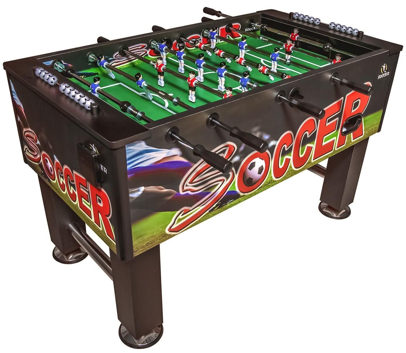 - Для коммерческого использования. Они могут устанавливаться в торгово-развлекательном центре или детских комнатах, в барах и кафе. Эти столы отличаются прочным основанием, их фигурки покрыты специальным защитным слоем, возможно наличие жетоноприемника.