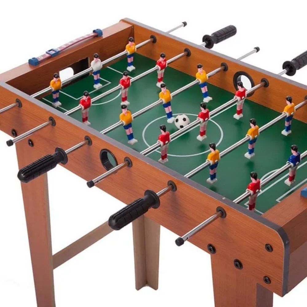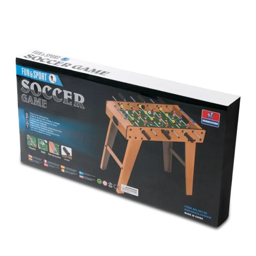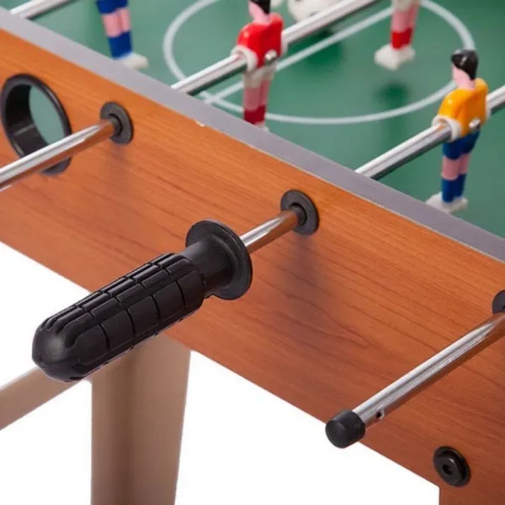 Вся конструкция прикреплена к высоким ножкам и выполнена из качественного материала. Большой настольный футбол оборудован 6 рядами специальных штанг с удобными пластиковыми ручками, с помощью которых Вы управляете миниатюрными фигурками футболистов.