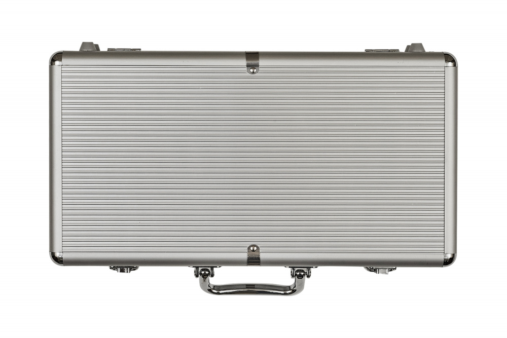 Кейс изготовлен из прочного металла. В нем компактно умещаются несколько классических колод карт, комплект фишек разного номинала, сделанные из композитного пластика, набор акриловых кубиков и фишка для дилера: все необходимое для полноценной игры в покер.