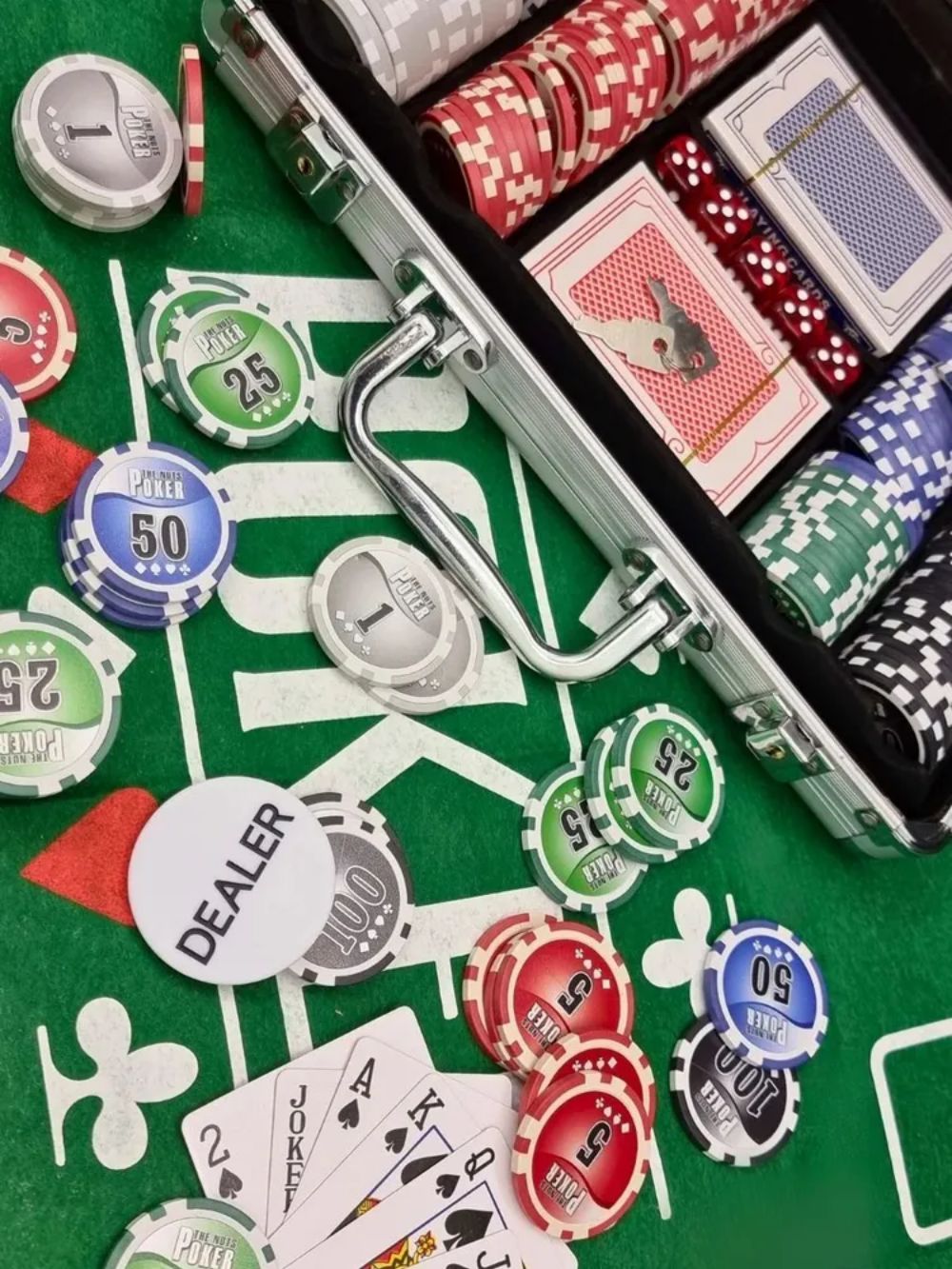 Фишка дилера, 200 фишек различных номиналов, игральные кости и 2 колоды карт с пластиковым покрытием собраны в стальном кейсе с ключами, который, благодаря своим габаритам, всегда удобно брать с собой.
