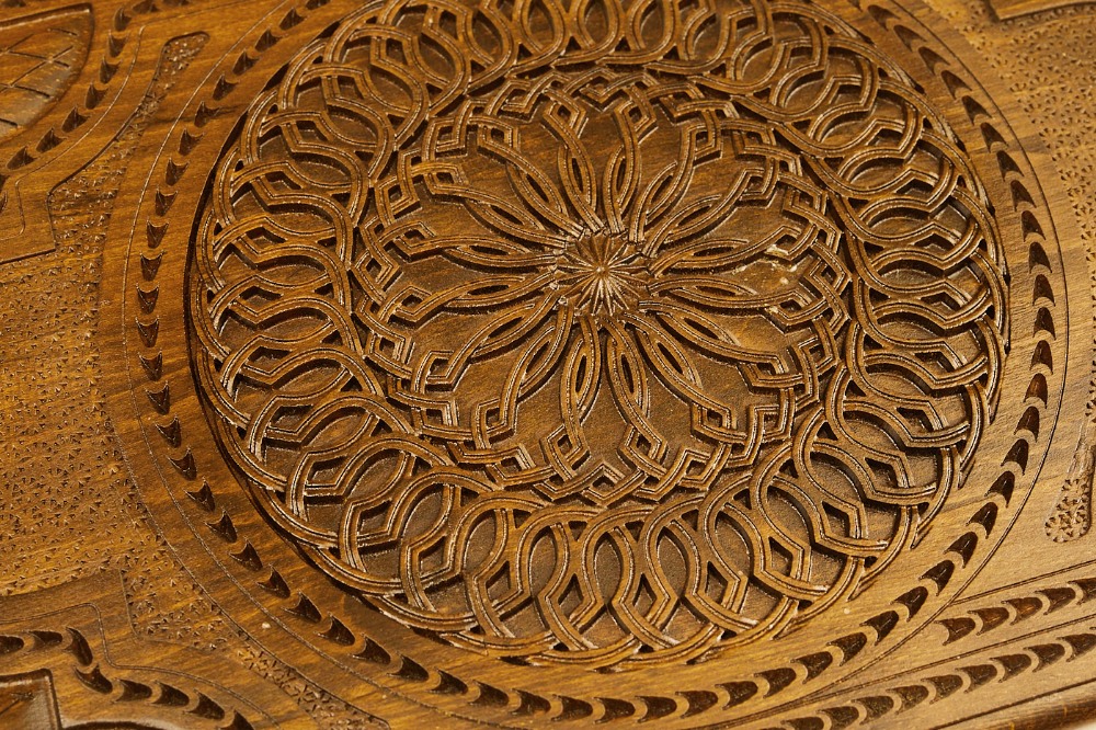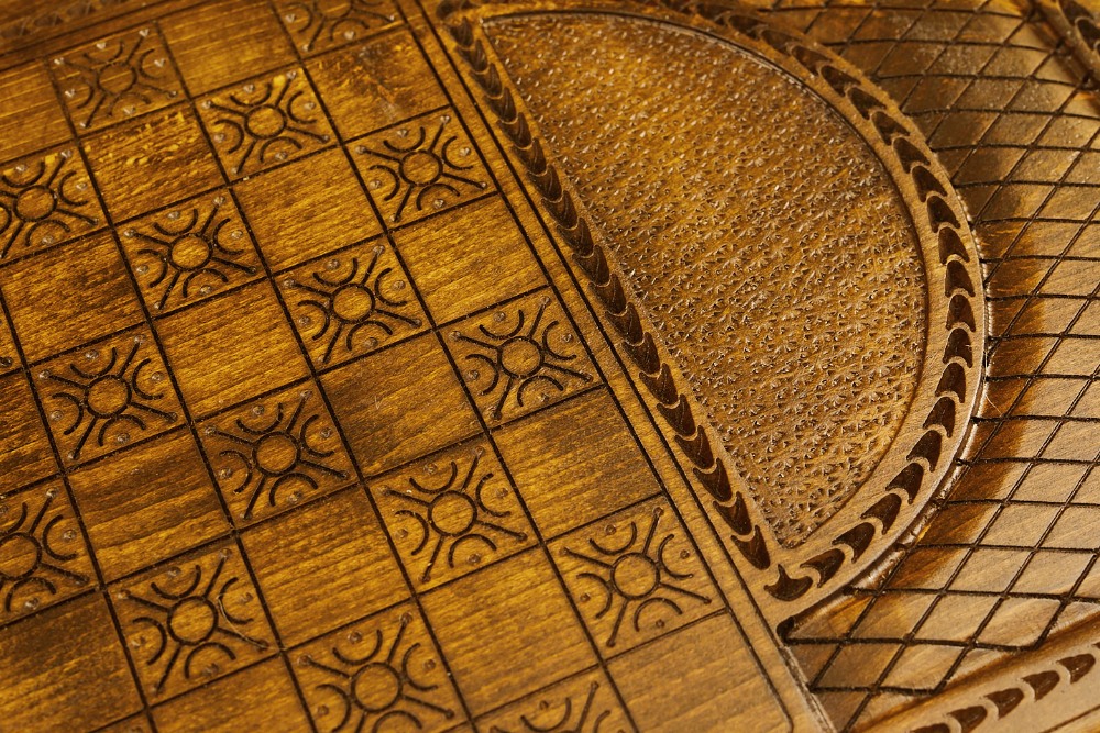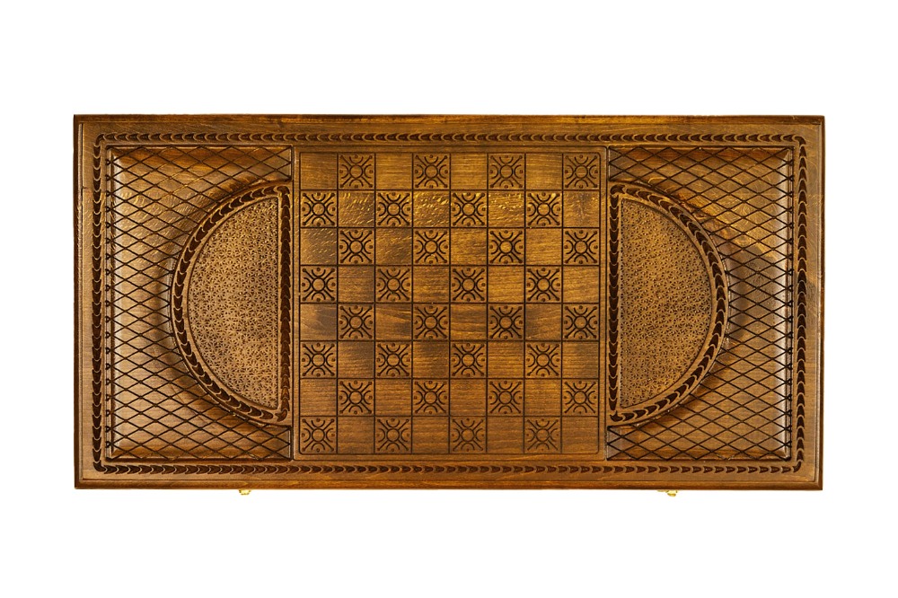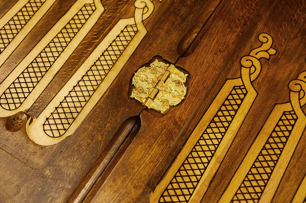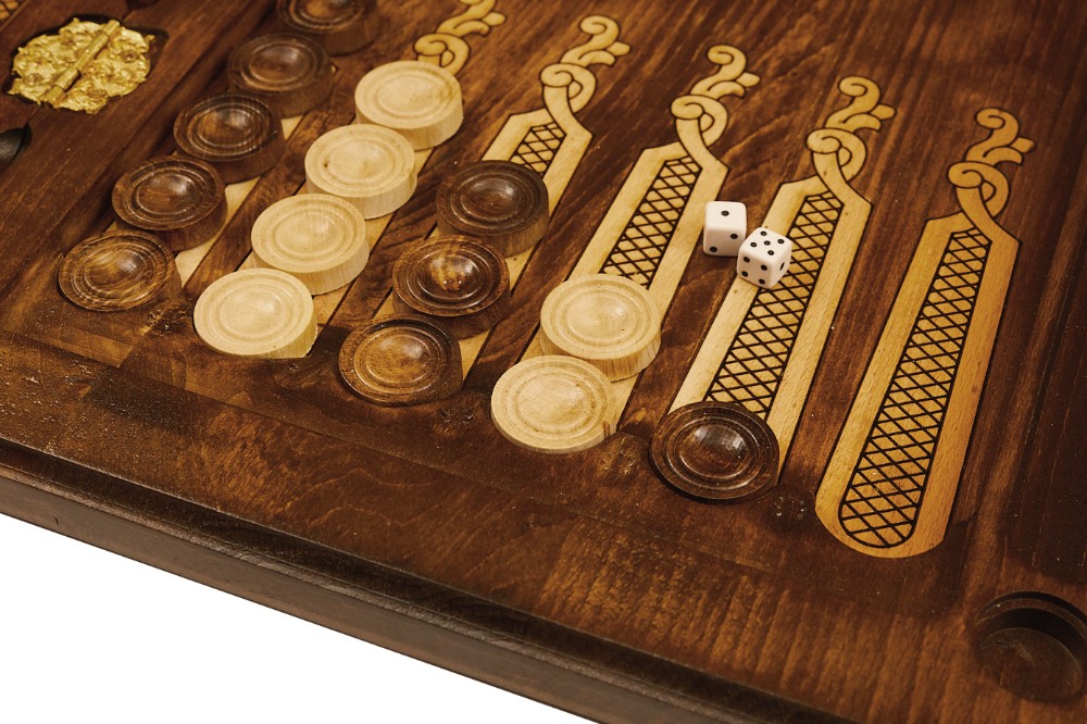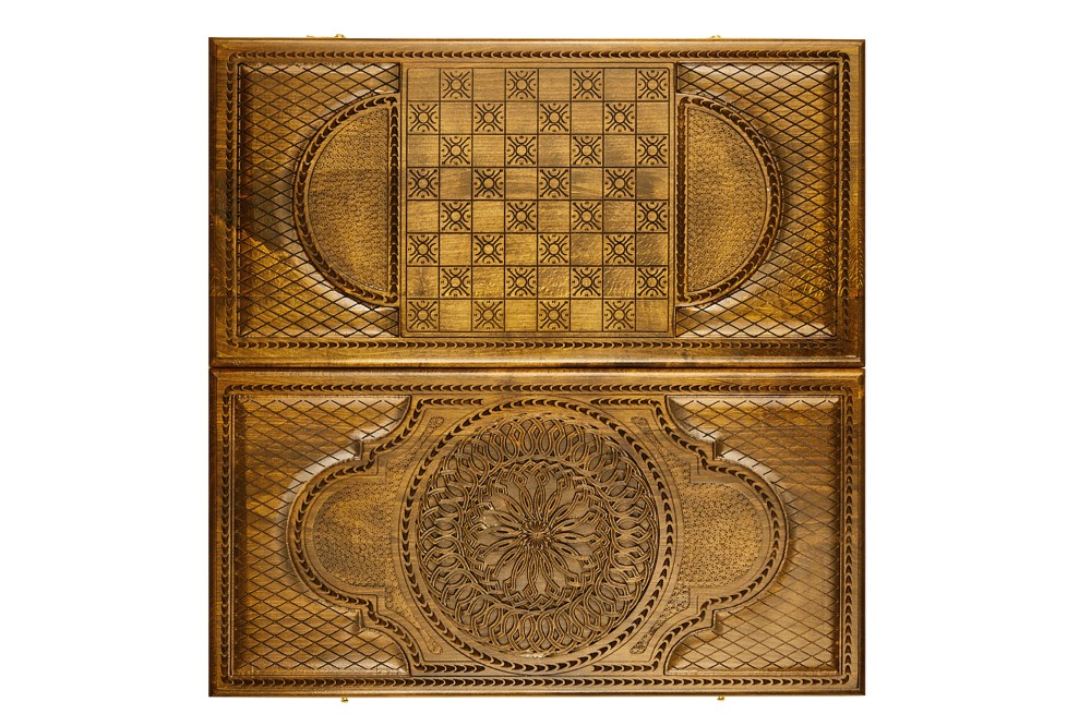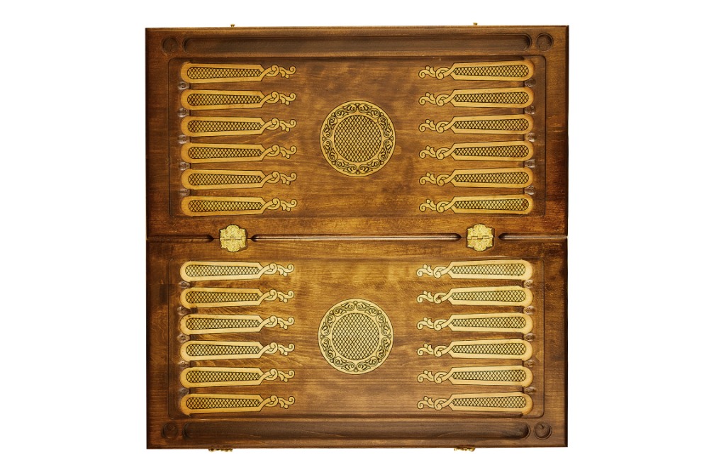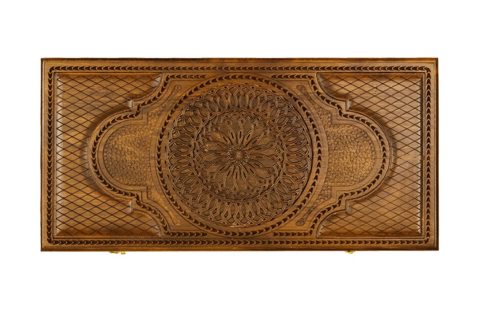 Уникальный комплект нард ручной работы от знаменитого армянского мастера - истинное произведение искусства. Сделанная из натуральной высококачественной буковой древесины доска декорирована оригинальными резными узорами. Устойчивой и прочной ее делают покрытие глянцевым лаком и дополнение надежной медной фурнитурой.