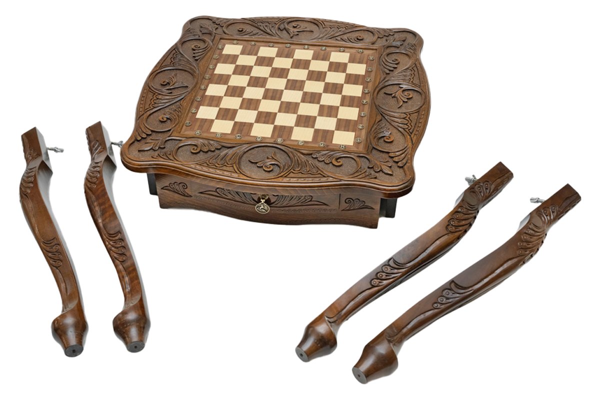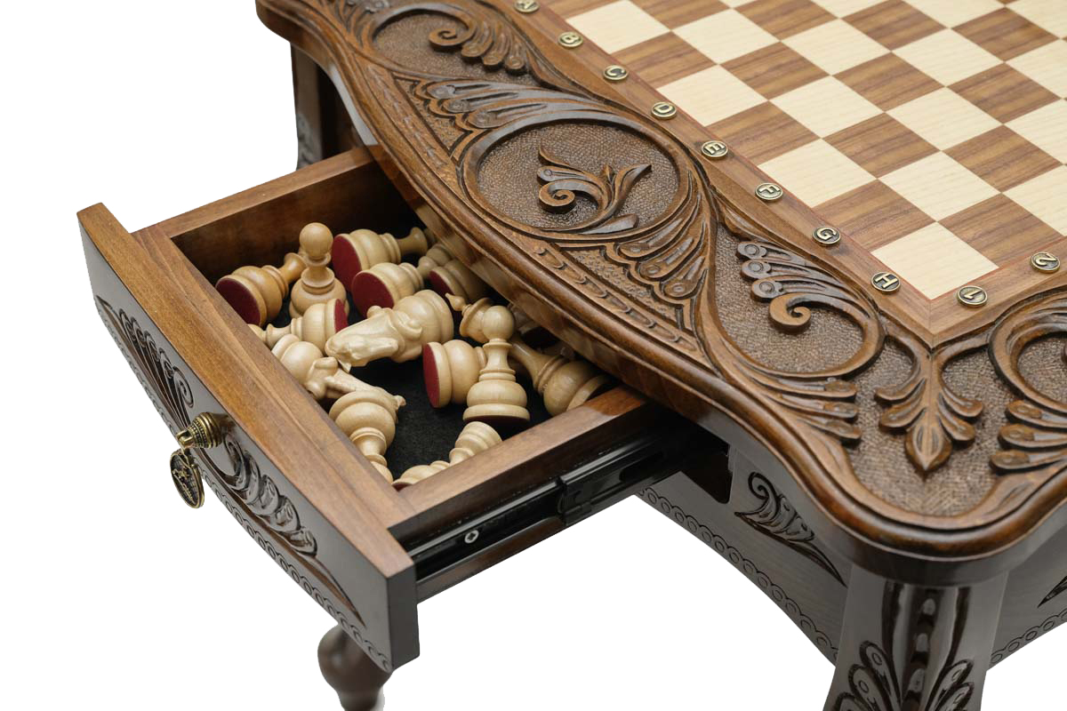 - Встроенная шахматная доска: На поверхности стола обычно расположена встроенная шахматная доска, что удобно для быстрой подготовки к игре и обеспечивает стабильную игровую поверхность.
