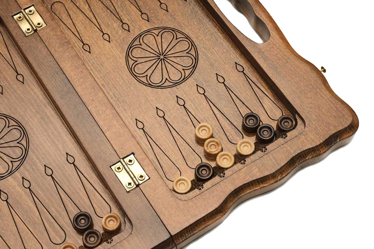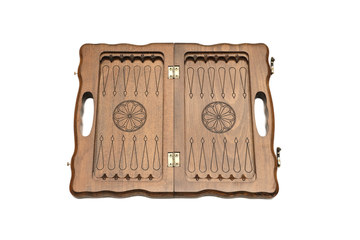 Сама доска выполнена из прочного букового дерева, обработанного специальным составом, сверху которого нанесено лаковое покрытие. Одна из створок, с внешней стороны, украшена красивым изображением горы Арарат, что сразу напоминает нам, откуда они «пришли». Об этом же говорят и логотипы мастера в форме буквы H, которые встречаются на крючках и петлях. Сами они выполнены из бронзы и выдержат очень много циклов открывания-закрывания.